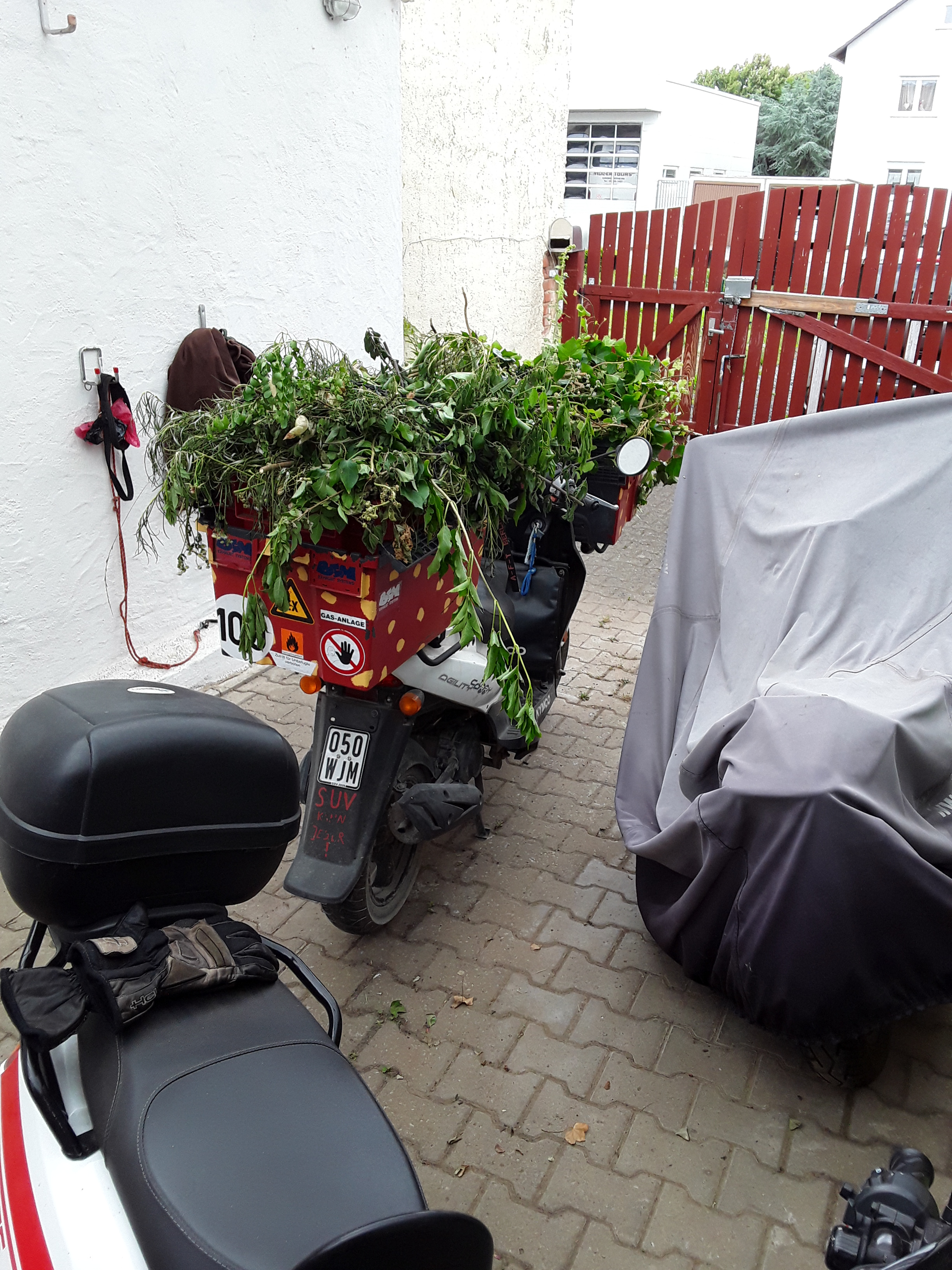 Vordergrund NIU Topcase, Hintergrund KYMCO CARRY fertig zum Abtransport Grünschnitt,alles kann der NIU nicht ersetzen