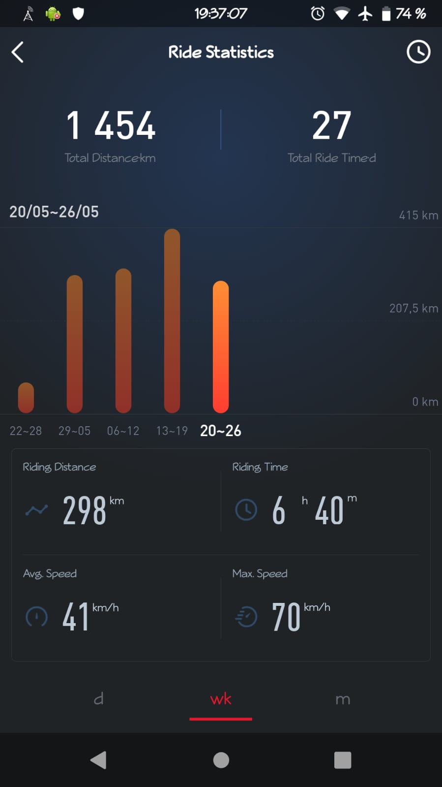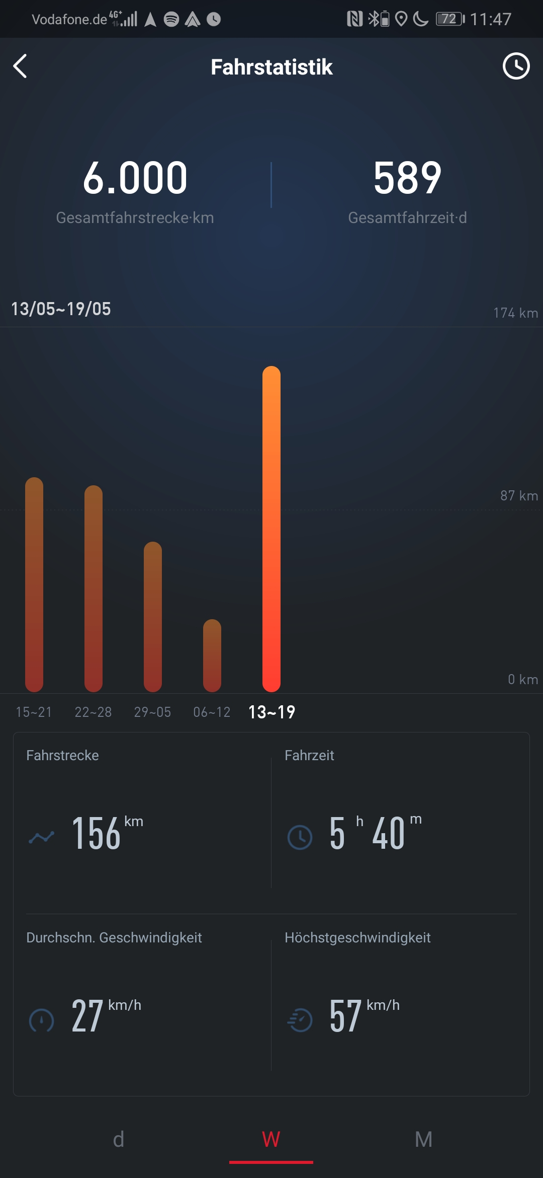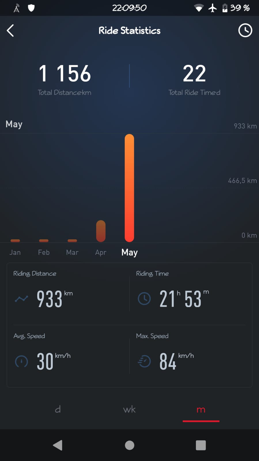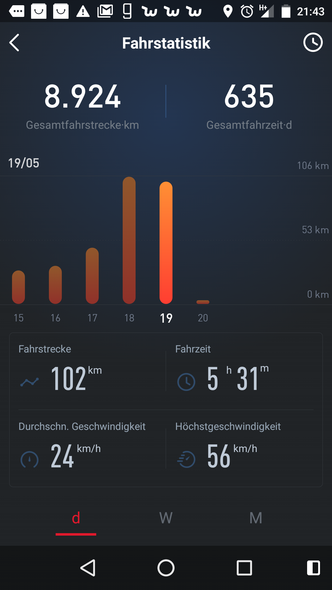 Heute meinen persönlichen Tagesrekord eingefahren, bei bis zu 30° in der Sonne fühlten sich die Akkus wohl und der Akkustand sank anfangs seeehr langsam. Ich habe am Tacho 113km abgelesen (GPS 104,4km) und noch 5% bis zur Reserve gehabt. Die App hat aber anscheinend nach korrigiert, womit GPS und App beinahe übereinstimmen. Normalerweise ergeben sich bei mir aber 8% Abweichung nach oben.