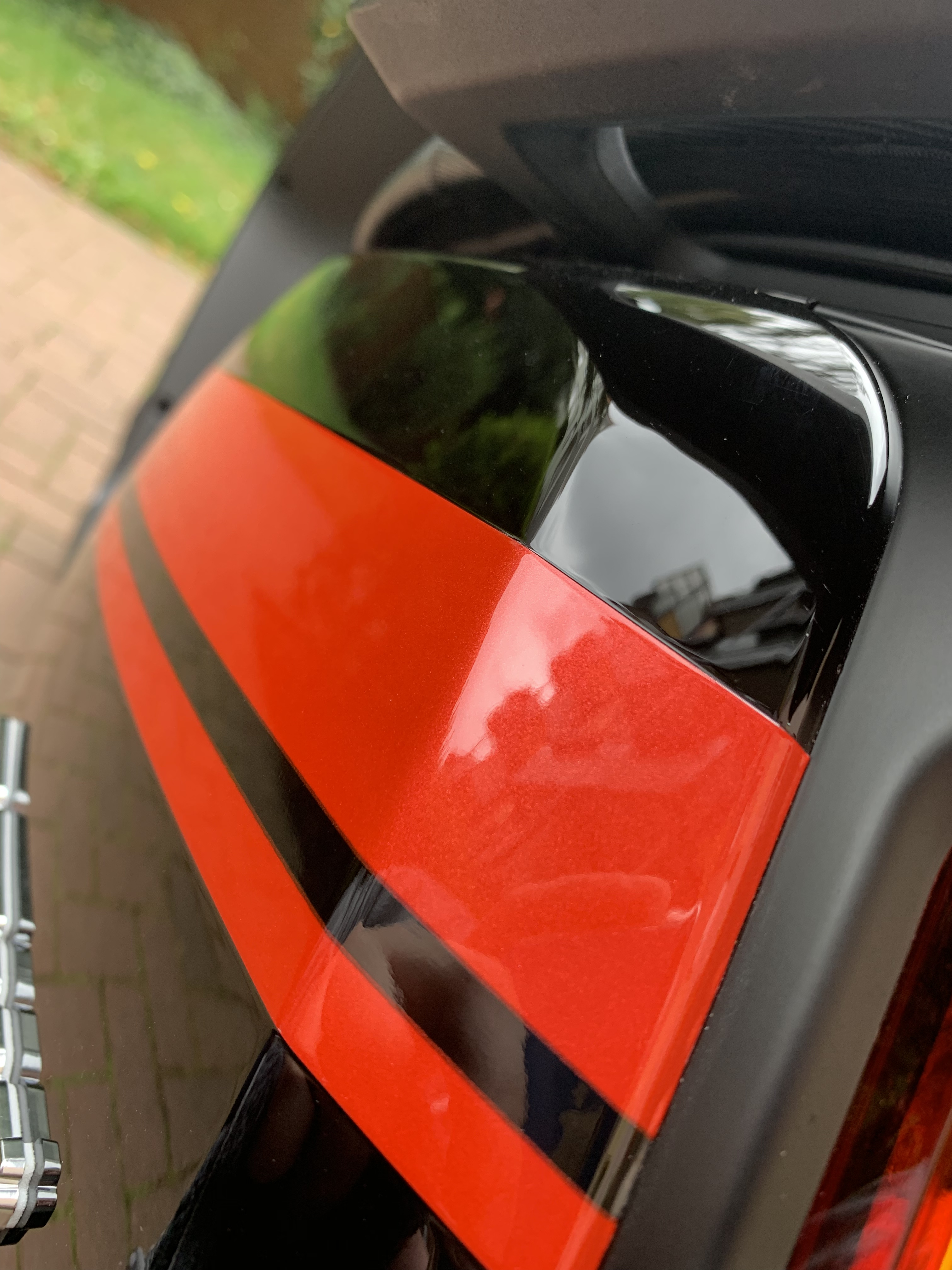 Ich zögerte zwischen aufgeklebten Streifen, die mit Klarlack beschichtet waren, und bemalten Streifen, auf dem Indiegogo-Kommentarabschnitt verwendet das Niu-Team das Wort "painted" und das Wort "coated " im Telegrammchat.