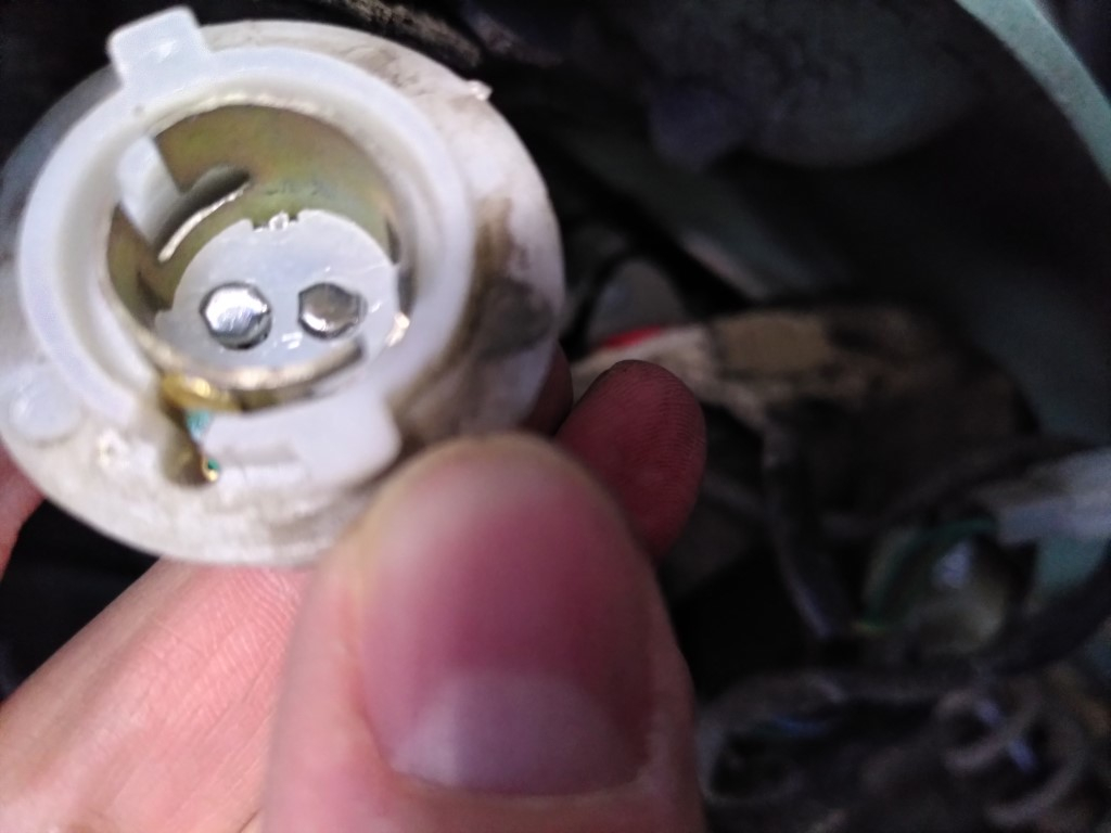 Und hier die Fassung des Unu Classic, für Birnensockel BAY15d: Man sieht die äußere Fassung mit dem Schlitz, der den Pin führt, erst nach unten, dann nach rechts. Und der Schlitz endet etwa bei 11 Uhr. Er müsste aber bis kurz nach 12 Uhr gehen, damit die beiden Kontakte der Birne genau auf den Kontakten der Fassung landen. Die ersten 10k km hat das offenbar noch gerade funktioniert, aber dann hat sich vielleicht was verzogen, Plastik gealtert, oder sonstwas, und für einen der Pins reicht es jetzt nicht mehr. Ich hab schon versucht, die äußere Fassung (den Metallzylinder) zu drehen, aber alles ist festgeklebt. An den Pins könnte ich rumbiegen, bis es vielleicht wieder klappt, aber mir ist das zu unsicher, das Rücklicht ist ja doch sehr sicherheitsrelevant.
