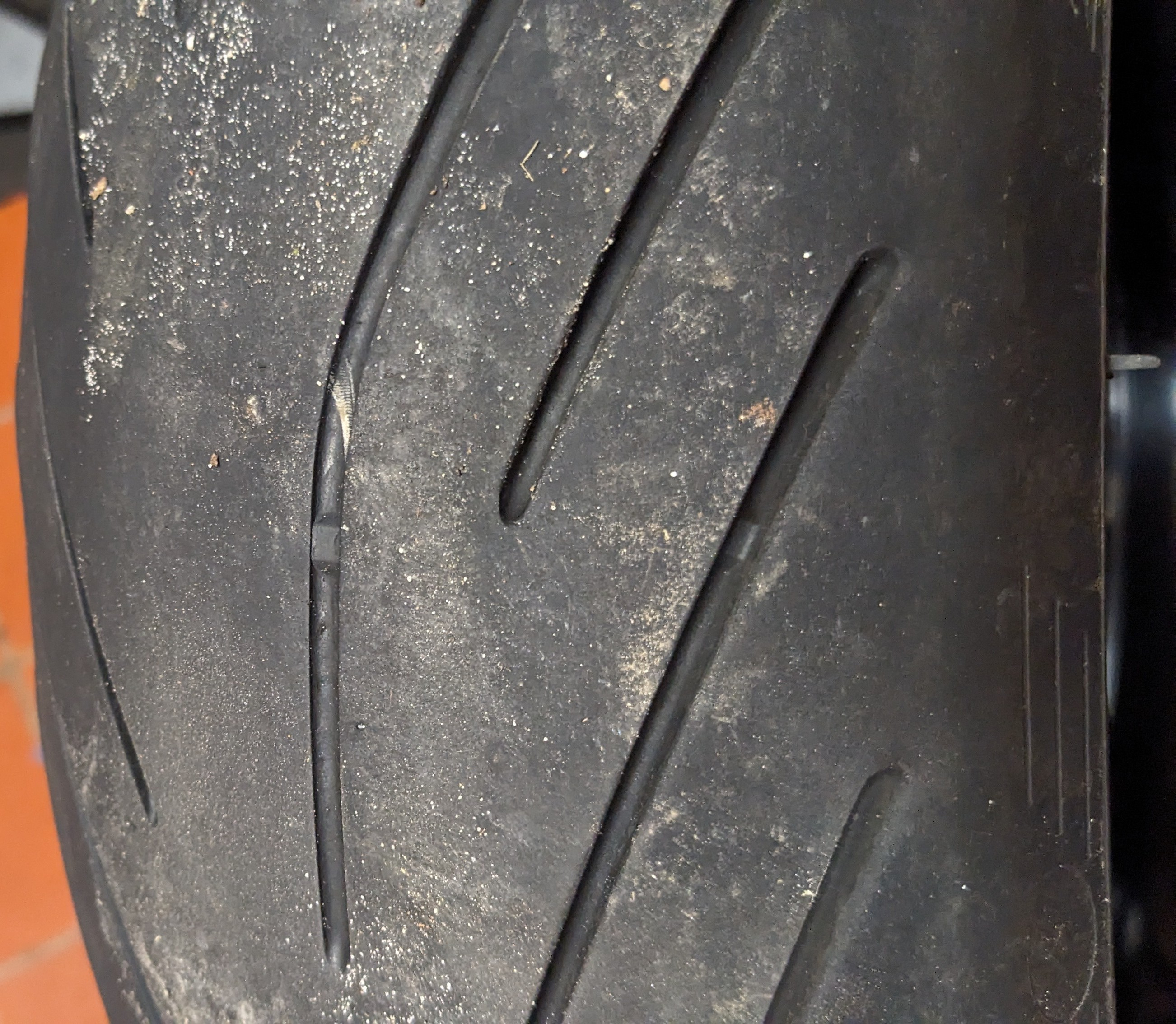 Der vordere Pilot Power 3 hat 4700km und ist noch ziemlich gut verglichen mit dem hinteren. Also was man hinten verliert, gewinnt man u.U. vorne. Hier ist der Michelin invers zum Pirelli, quasi "normal". Was ich noch erwähnen sollte: mein Roller wurde ja kürzlich von BMW mehrmals leergefahren wegen der Ladetests. Das ist sicher nicht schonend erfolgt, das waren nicht so viele Kilometer, und dabei wurde sicherlich der Mittenbereich stark verschlissen.