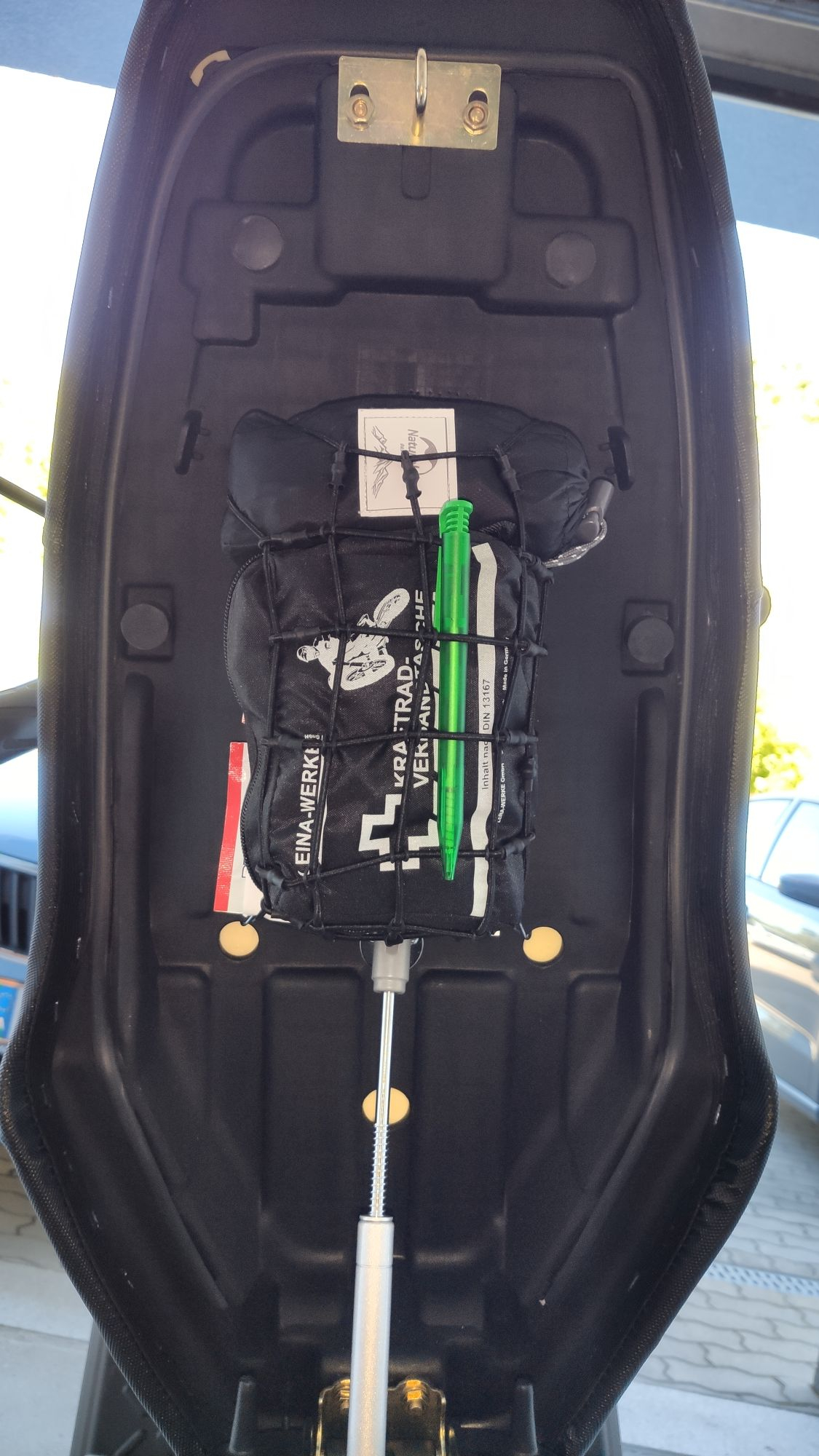 Da meine Sitzbank - wie die von inzwischen vielen anderen auch - "automatisch" öffnet, passt aber die auch hier im Thread schon vorgestellte Tasche leider nicht mehr. Ich darf hier also meinen Lösungsansatz vorstellen - vielleicht hilft´s ja dem einen oder anderen. Deswegen sind wir doch alle hier, oder?