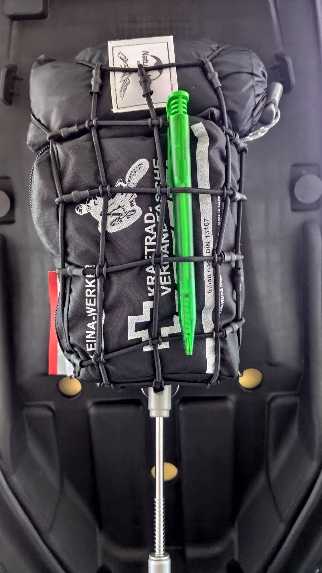 Dort habe ich nun verstaut: Verbandszeug, Papiere, Kugelschreiber, Helmputztücher und im oberen Bereich einen zusammenfalbaren, sehr kompakten Rucksack.