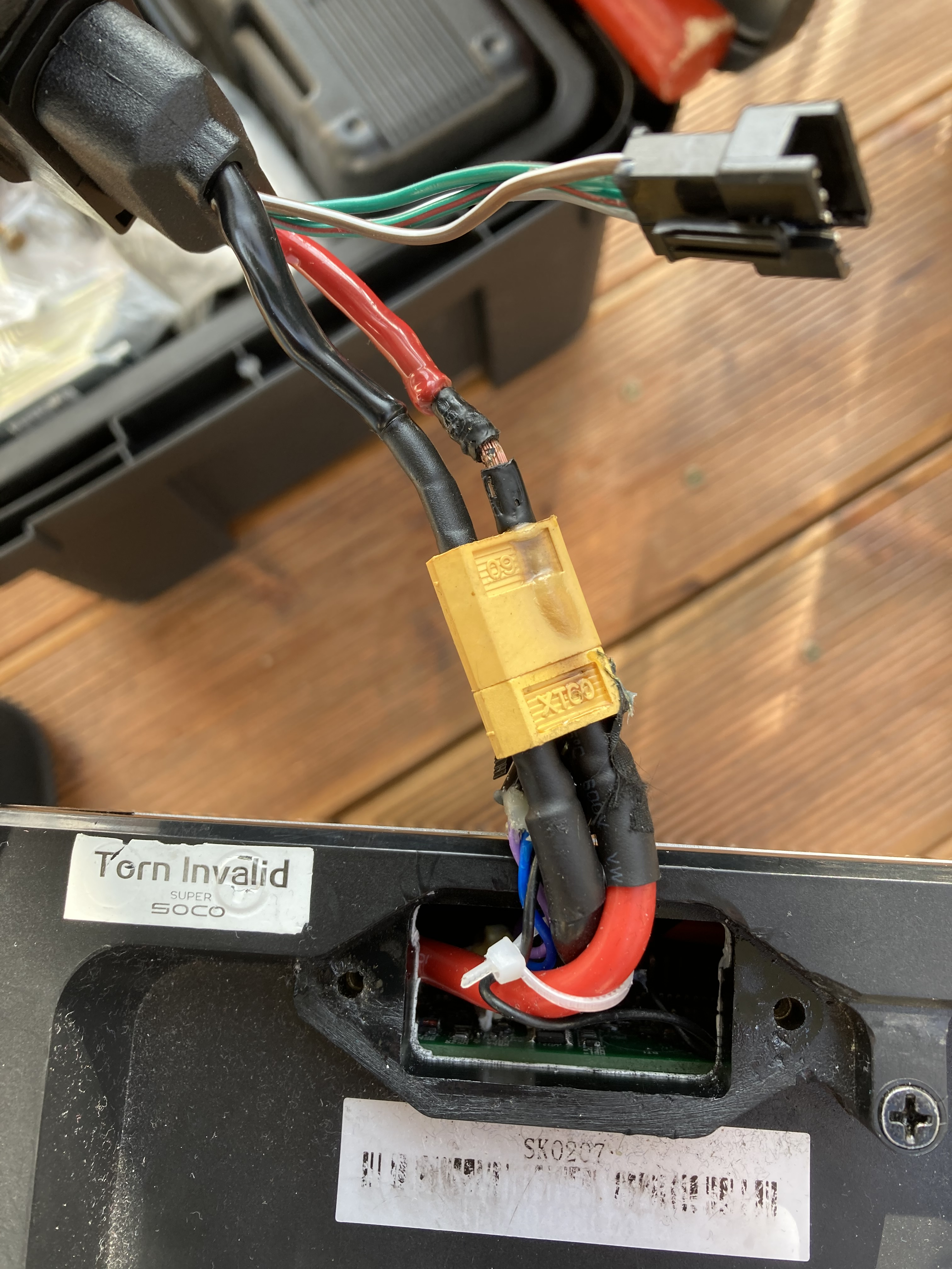Bereits im Juni 2019 konnte ich den Stecker der TC nicht mehr von dem Akku lösen. Garantieantrag beim Händler erstellt; bis November wurde ich immer wieder vertröstet... "Neuer Kabelbaum und neuer Akku sind nicht Lieferbar". Ich habe dann den Händler gewechselt und schwups... Nach zwei Wochen wurde die TC mit einem Rep-Kit repariert. Seit der Reparatur habe ich nach jeder Fahrt den Stecker kontrolliert. Ab Frühling 2020 waren dann die ersten Schmelzanzeichen zu erkennen. Im Juni konnte ich den Stecker nicht mehr lösen. Seit dem Kauf bin ich bis zum Juni etwa 2500 Km gefahren. Da ich nicht der Einzige mit diesem Problem war und es sich schon wiederholt hat, habe ich mich dazu entschieden, die gesamte Verkabelung (TC<>Akku) auf 10er AWG und Anderson-Stecker umzurüsten. Seither keine Probleme mehr.