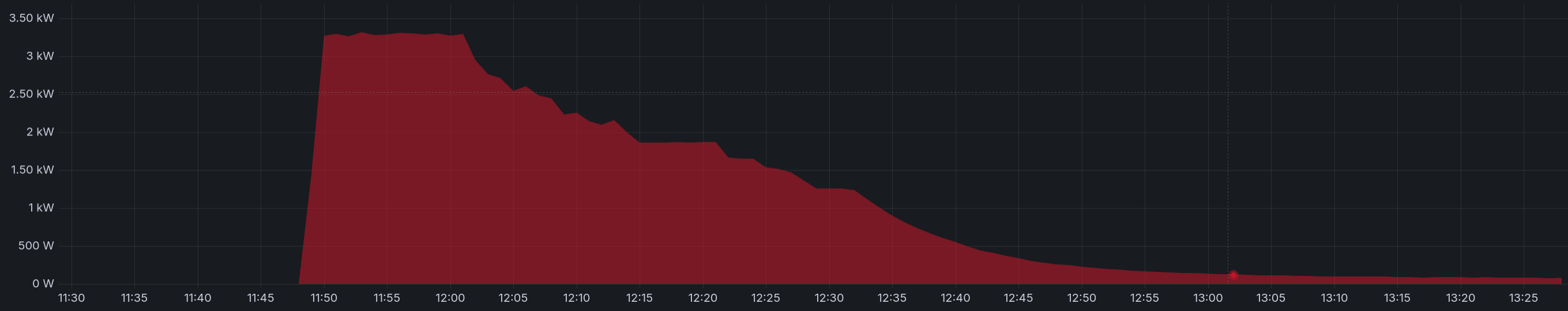 • Mit 16A und meinem verbauten 3,3kW Lader funktioniert es fehlerlos bis 100%. Die Leistung die dabei in den letzten 2h aus der Steckdose gezogen wird seht ihr im Diagramm