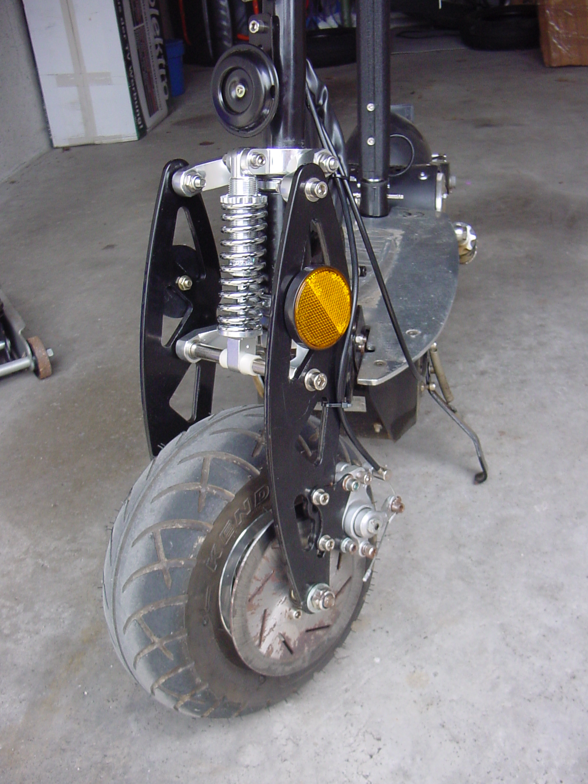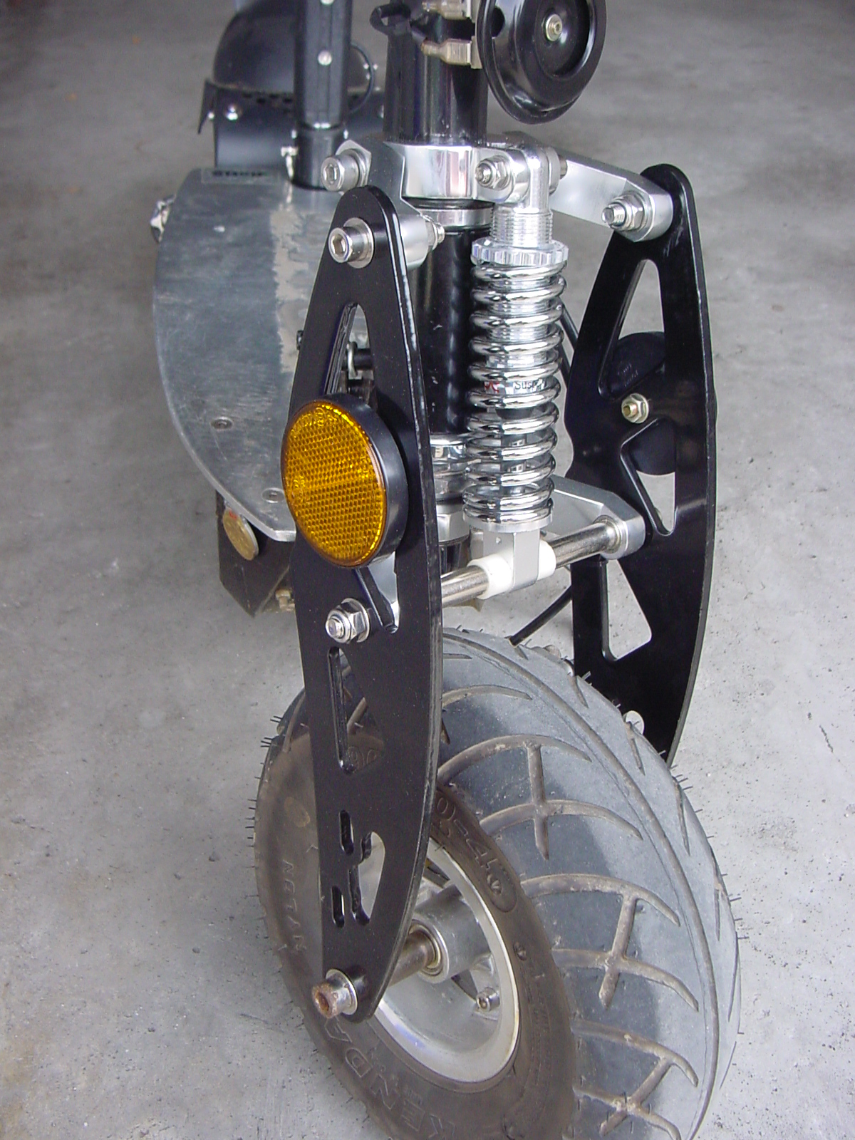 Komplett mit montierten Seitenstrahlern sieht das dann so aus: Nach einer Probefahrt und mehrmals nachgezogenem Lenkkopflager kann ich sagen, dass diese Lösung dem Roller ein WEIT solideres Lenk- und Fahrgefühl gibt. An den weichen "U-Schenkeln" Lenkrohr und Sitzrohr ändert die kugelgelagerte Vordergabel aber natürlich nichts, so dass immer noch genügend Verwindung im Roller steckt, um einem zumindest noch ein leicht mulmiges Fahrgefühl zu erhalten