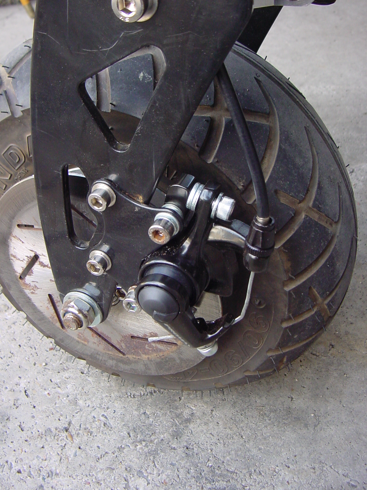 Da es bislang keine Bilder darüber gibt stelle ich jetzt mal meine hier ein. So sieht der "ProMax"-Sattel für 160mm Bremsscheiben am Rolektro mit der komplett kugelgelagerten Vordergabel aus: Da wie gesagt keine Quereinstellung möglich ist musste ich den Sattel mit gleich drei U-Scheiben in Richtung Bremsscheibe positionieren, um das Schleifen zu minimieren: Blöd ist, dass es mit den Standard-Langlöchern an der Vordergabel nicht möglich ist, den Sattel radial so über der Bremsscheibe zu platzieren, dass zugleich die gesamte Belagfläche die Bremsscheibe "beglückt" UND die Scheibe am Außendurchmesser nicht oben am Sattel schubbert: Aber schon so ist der Unterschied der Bremswirkung zum original-Sattel absolut atemberaubend: Kurz vor Stillstand lupft es dem Rollektro selbst mit mir schwerem Brocken drauf kurz das Hinterrad