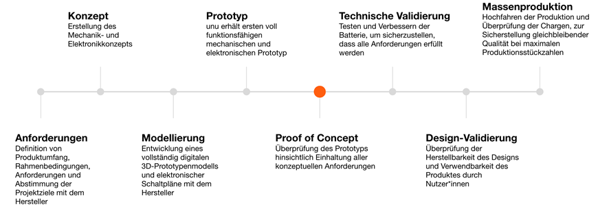 Anhand der Timeline siehst Du, wo wir gerade stehen und was bisher passiert ist. Gerade haben wir den ersten Prototypen der neuen unu Scooter Classic Batterie erhalten. Diese wird nun von dem Produzenten entwickelt, der auch die Batterien unserer neuen Produktgeneration herstellt. Ein entscheidender Vorteil daran ist, dass wir in diesen Prozess enger als je zuvor direkt eingebunden sind. Nachdem wir Ende letzten Jahres die Anforderungen an die Neuauflage erstellt und übermittelt haben, handelt es sich bei dem Prototypen um den ersten Vorschlag des Herstellers. Wir testen nun diese Prototypen, um sicherzustellen, dass unsere funktionalen und designtechnischen Ziele erreicht werden. In diesem Prozess erteilen wir dem Hersteller auch die Freigabe, den Werkzeugbau für die Kunststoff- und Gehäuseteile zu starten.