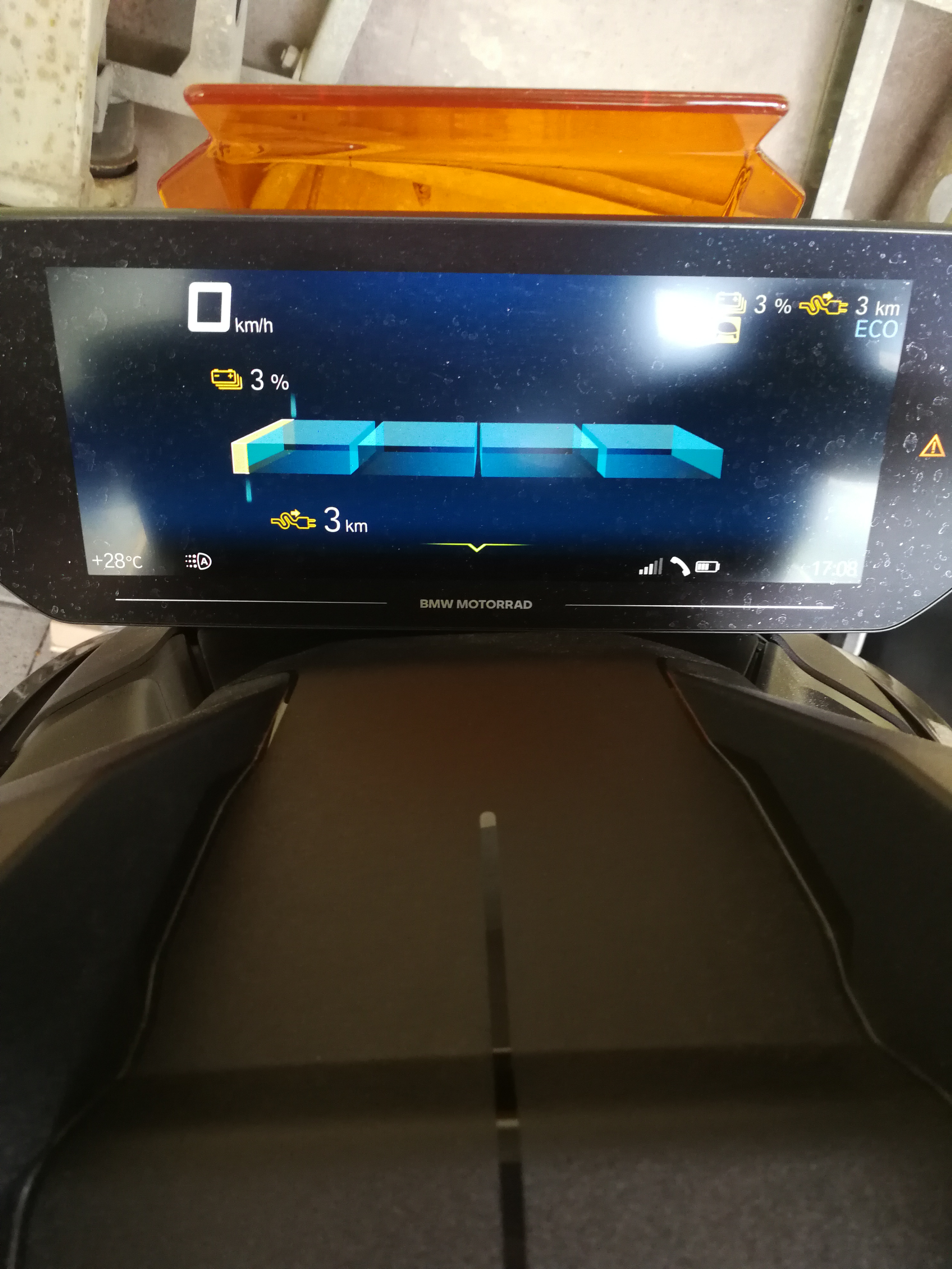Derzeit nach Heim-Vollladen im regelmässigen Überlandtouringbetrieb 119-125km angezeigte Reichweite mit 100%. Mit nagelneuen Reifen, wo der angezeigte Verbrauch deutlich höher ist als mit Altreifen.