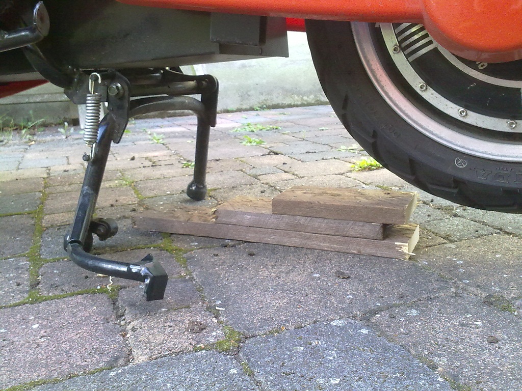 Roller auf Hauptständer mittels Rampe, funktioniert eaaasssyyyy, habe ich aber natürlich nicht unterwegs dabei: Roller gestrippt (ja, natürlich suche ich mein Werkzeug farblich passend zum Roller aus