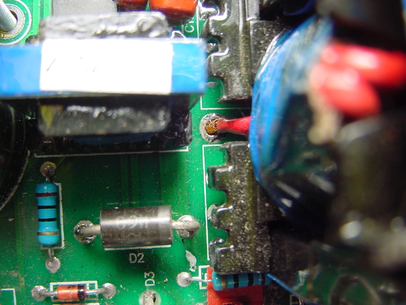 Was nicht gerade verwundert, da am unteren Bildrand links das MOSFET lauert, mit dem 10 Ohm Widerstand und den zwei Dioden dierkt darüber, die zwischen den äußeren Beinen des MOSFETS geschaltet sind. Die zwei Fetten 460er Dioden (D3 und D4) hatte ich einseitig ausgelötet und gemessen, sind beide i.O.