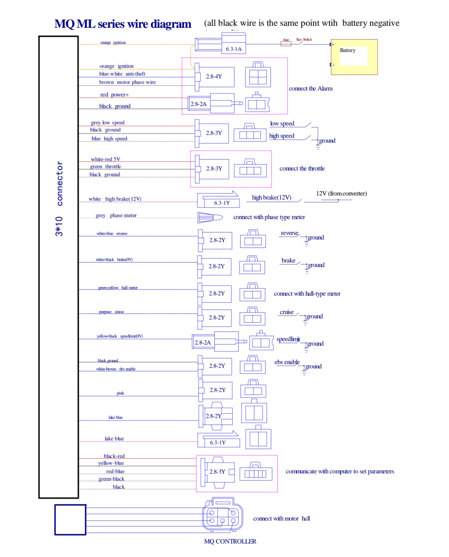 Mit dem Gasgriff ist alles ok. Mein Problem ist die Ader die zum Volmeter führt. Wenn ich den Stecker vom Controller entferne ligen auf der Ader immer noch 72V an. Irgendwo muss die Ader im Kabelbaum aufgeteilt sein in der der Strom zugeführt wird. Die kleine Schmelsicherung habe ich schon gefunden. Ich vermute mal das es so eine Art Steuersignal ist und damit der Kreislauf geschlossen wird. Ich schätze mal das ich es an "connect with phase type meter" angeschlossen wird. Liege ich da richtig?