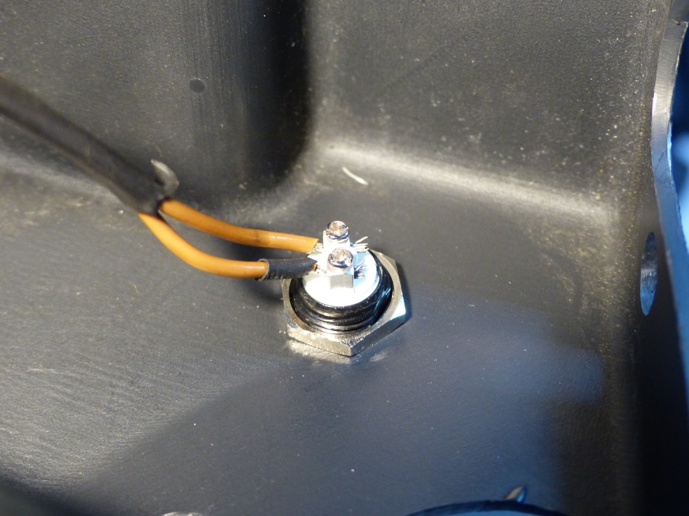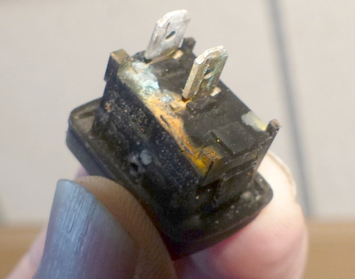 Vom bisherigen Rückwärtsknopf habe ich kein Bild gemacht, das war ein ganz lumpiges Teil. Aber hier der neue Rückwärtsknopf von innen. Er hat zwei ganz kleine "Lüsterklemmen" (ca. 1mm Durchmesser), wo die Litzen des Kabels nur mit Mühe durchpassten...