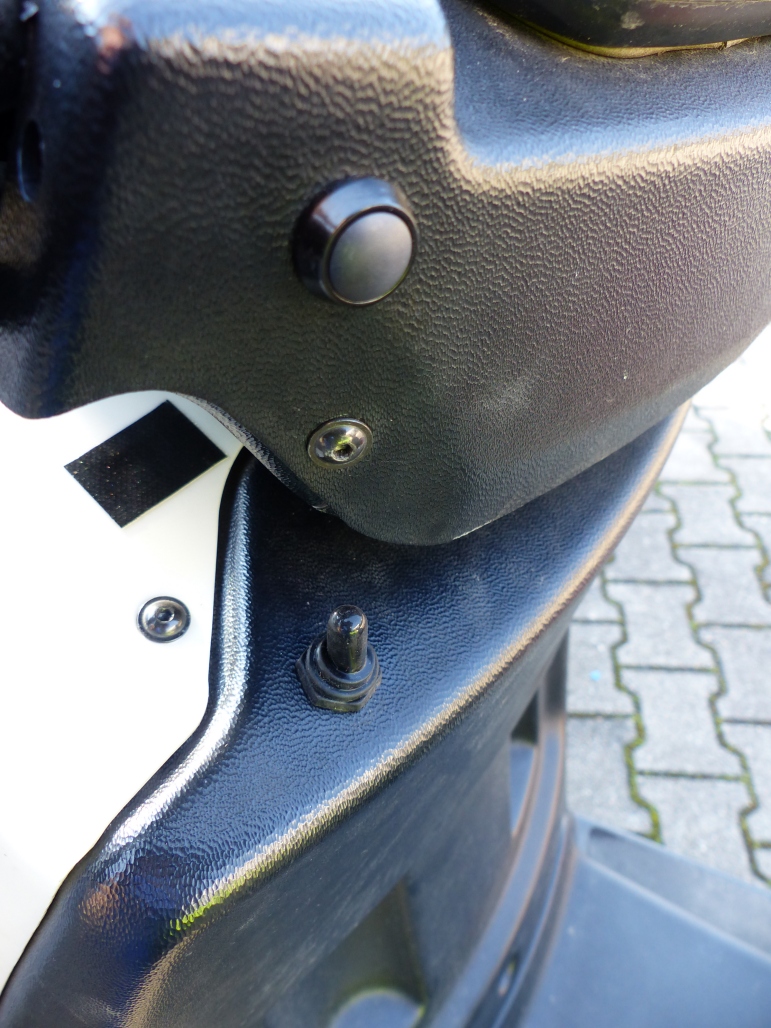 Der Kippschalter mit schwarzem Überzieher ist für den CA. Der Gummihut soll laut Bewertungen schnell kaput gehen, d.h. ein sorgsamer Umgang damit ist wohl angesagt. Das schwarze Rechteck auf dem weißen Frontschild ist der Einbauort des bisherigen Wippschalters, mit Panzerband abgeklebt, doch leider war der neue Kippschalter zu hoch, bei eingerastetem Lenkerschloss hätte er nur ausgeschaltet gepasst. Der Kippschalter hat zwei Zungen mit grob M3 großen Messingschrauben. Ich habe die zwei Kabelschuhe vom Kabel platt gedrückt und mit 3,2mm durchbohrt zur Befestigung. Bin gespannt, wie lange das hält...