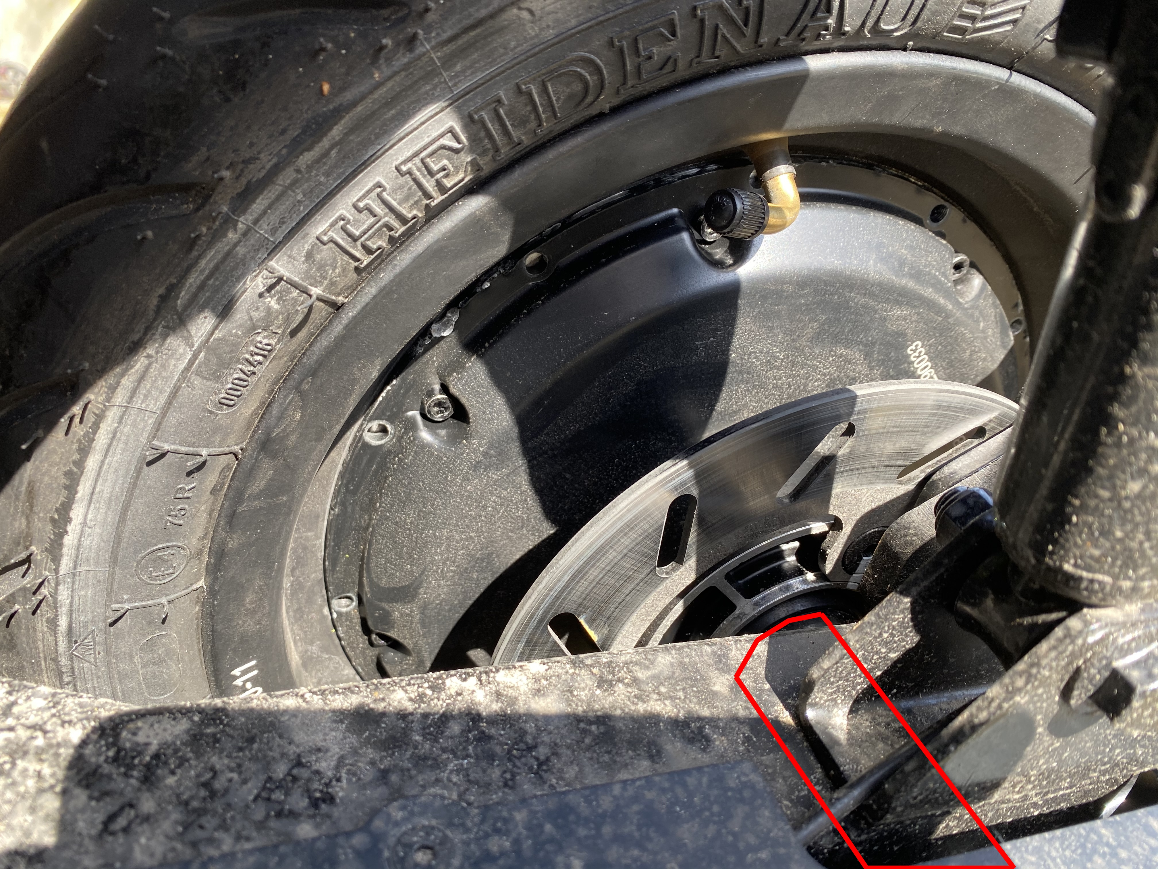 Hier nochmal ein Bild von der anderen Seite, nachdem ich den Reifen umgedreht habe. Leider habe ich nur ein Bild von der falschen Seite kurz nach Eintreffen des Rollers gemacht. Ob sich die Befestigung von selbst gelöst hat oder vergessen wurde, lässt sich leider nicht mehr nachvollziehen.
