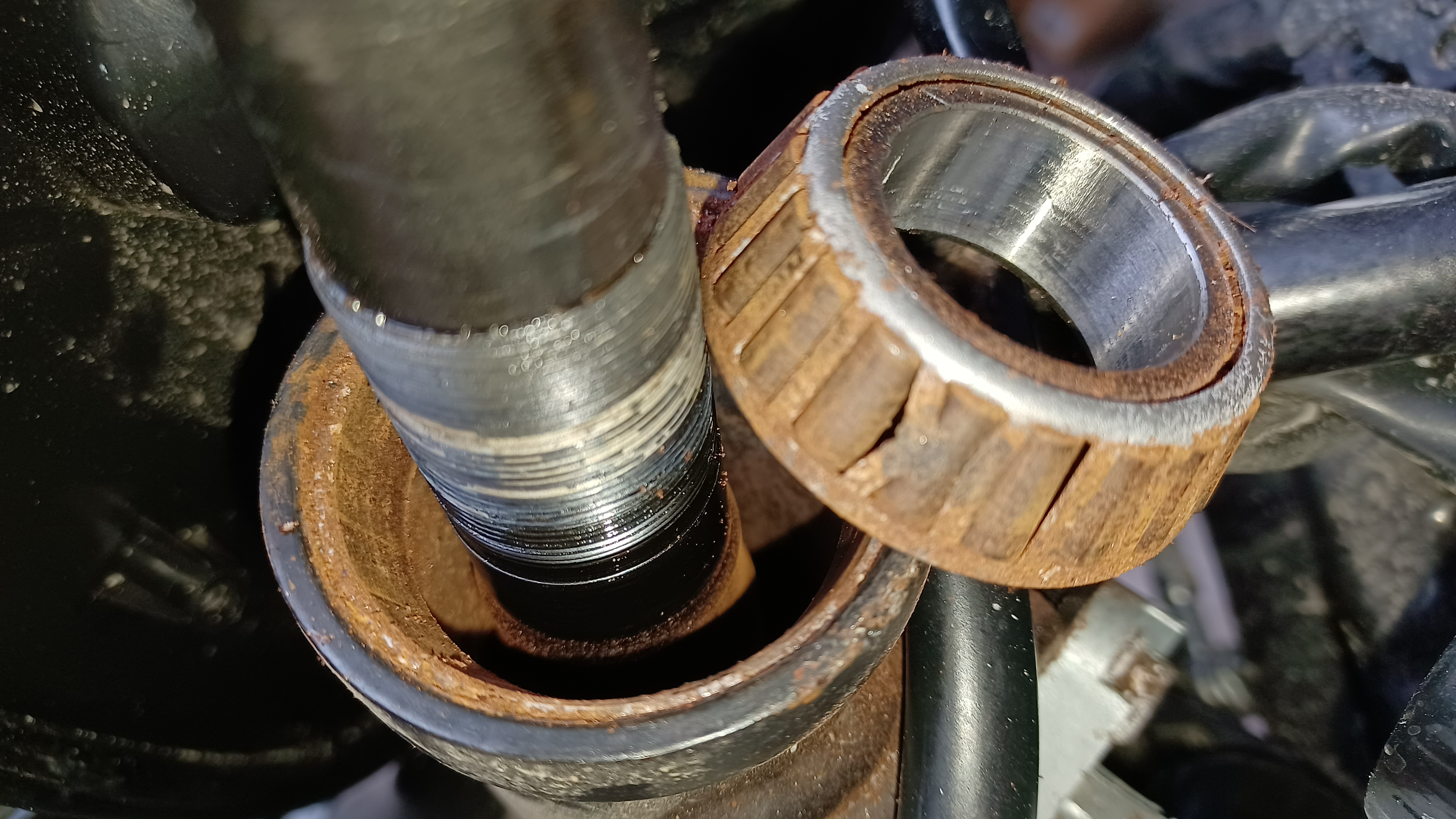 so sah mein oberes LKL nach nach gut einem halben Jahr und 5700 km aus. Das untere Lager konnte ich zwar immer nachfetten und so über den Winter kommen, aber irgendwann war das obere schlagartig fest und die Lenkung lies sich nur noch mit ziemlichem Kraftaufwand betätigen. Wäre was passiert, hätte man das juristisch durchaus bewerten können. hab mir jetzt neue japanische Lager mit Dichtungen und einer ordentlichen Fettfüllung eingebaut.