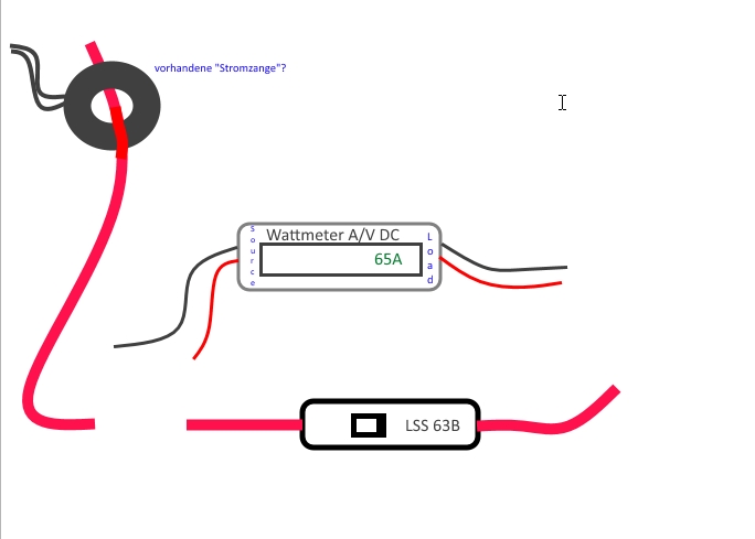 Nebenbei: Dieser Ring links oben in der Skizze (Stromzange?, Aufschrift "current" -> ein Stecker current ist auch am BMS, ich glaube da ist es auch angeschlossen) ist schon in der Nähe des LSS vorhanden. Ich hoffe, neben dem Wattmeter (siehe Url oben) braucht es keine zusätzlichen Bauteile