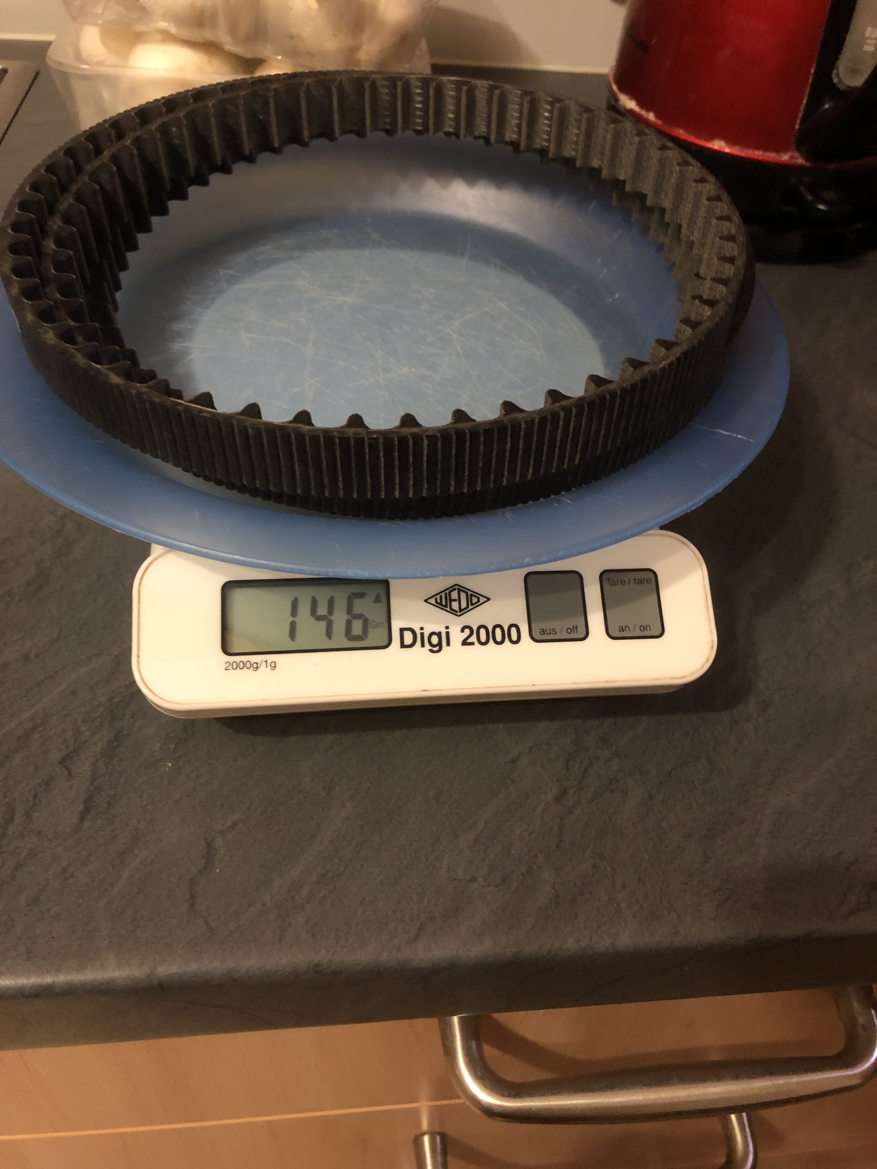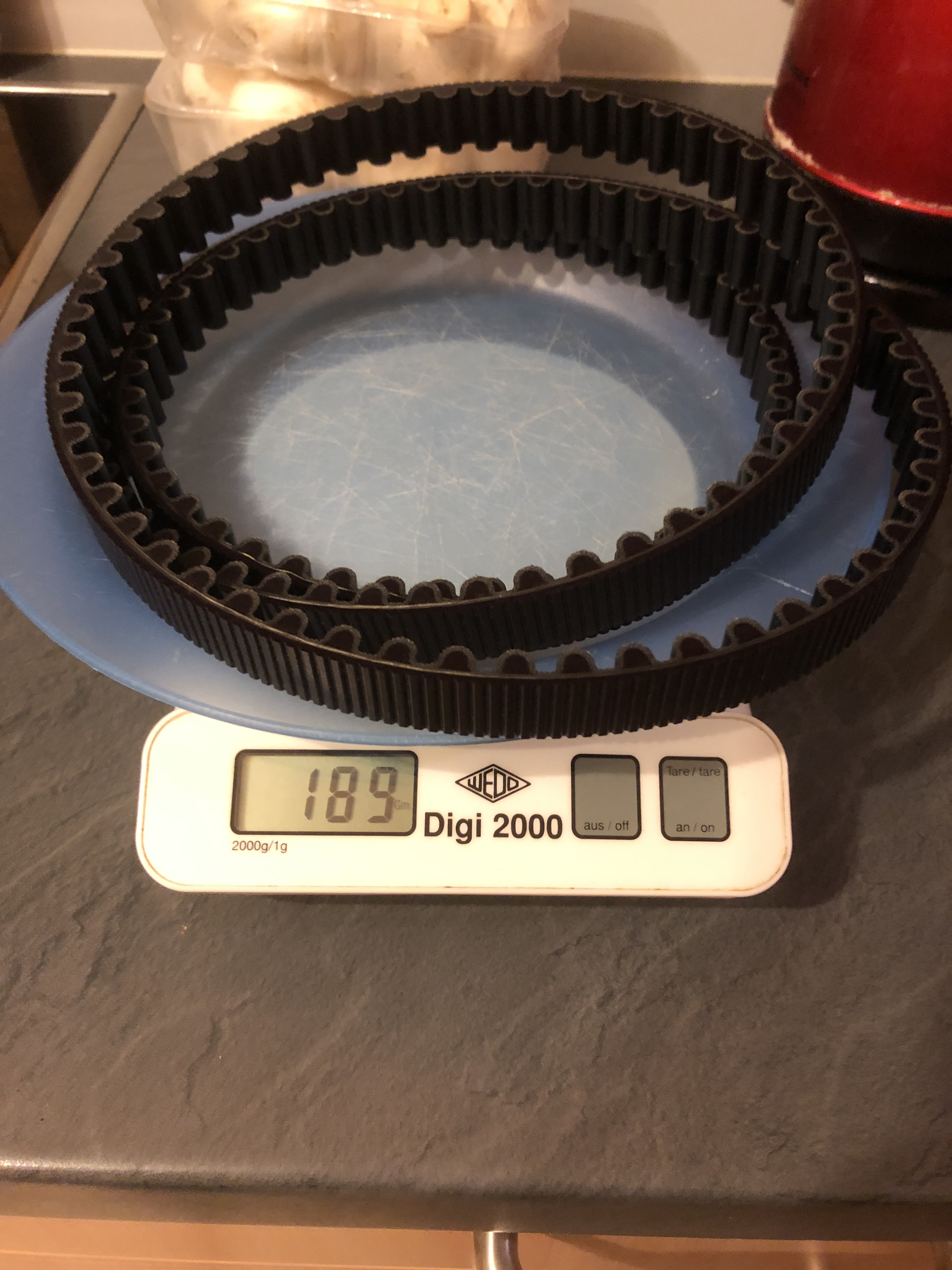 Nachdem ich erstmals einen Zahnriemen meiner "Baby" Zero S ("11kW" von neu bis völlig abgefahren nutzen konnte, über nur 16 501km, da ich ganzjährig fahre und Salz das Wachstum von Aluminium Oxid (das ist ein Keramik...) auf Zähnen fördert, habe ich zuerst einmal den neuen Ersatzriemen und den alten gewogen. Der Unterschied ist sehr substanziell