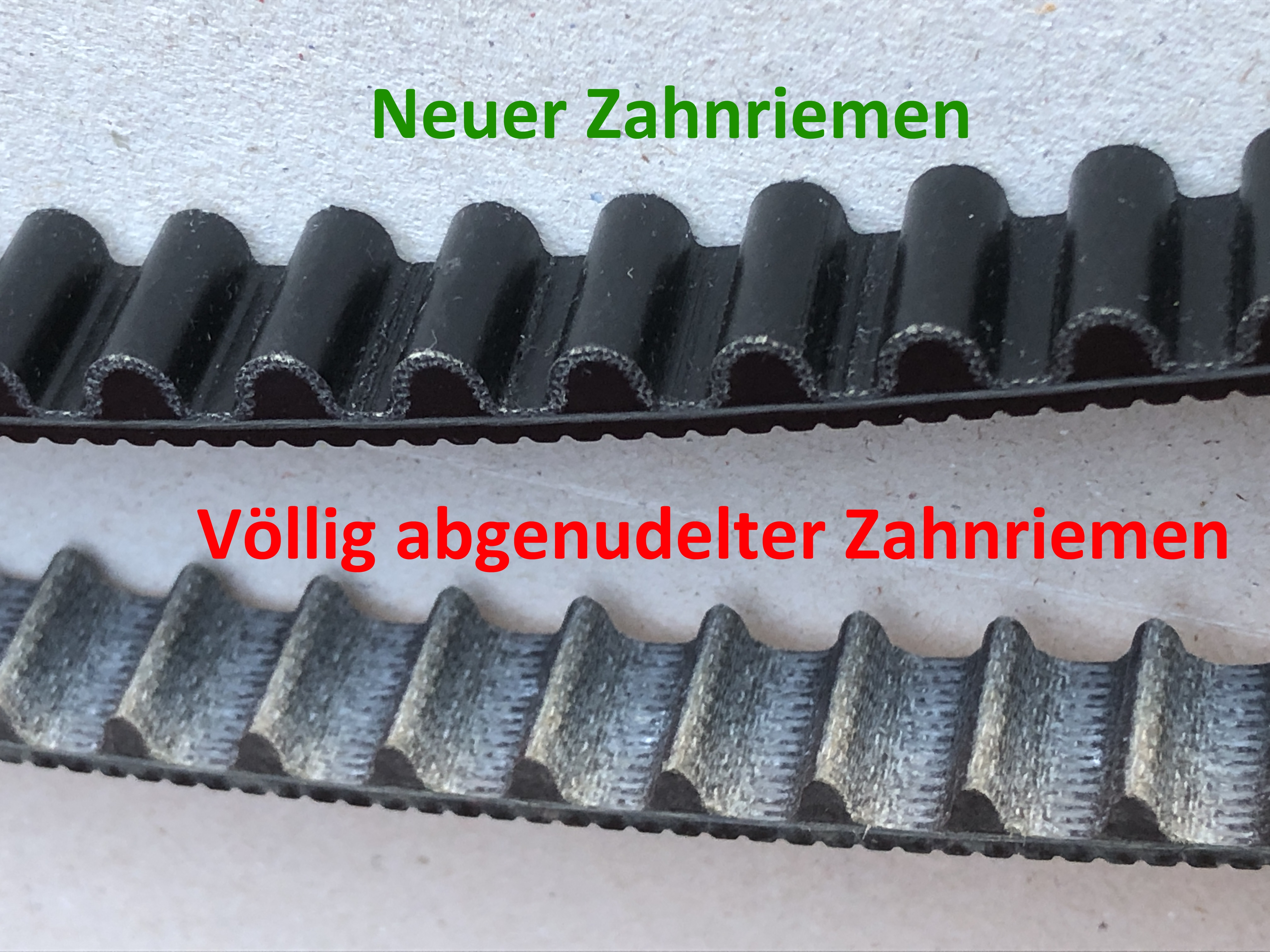 Man sieht deutlich, dass der alte bis auf die Trägerstruktur des Riemenrückens abgefahren ist - von der Deckschicht, die am neuen Riemen Zähne und Riemenrücken schützt, ist beim alten überhaupt nichts mehr da.
