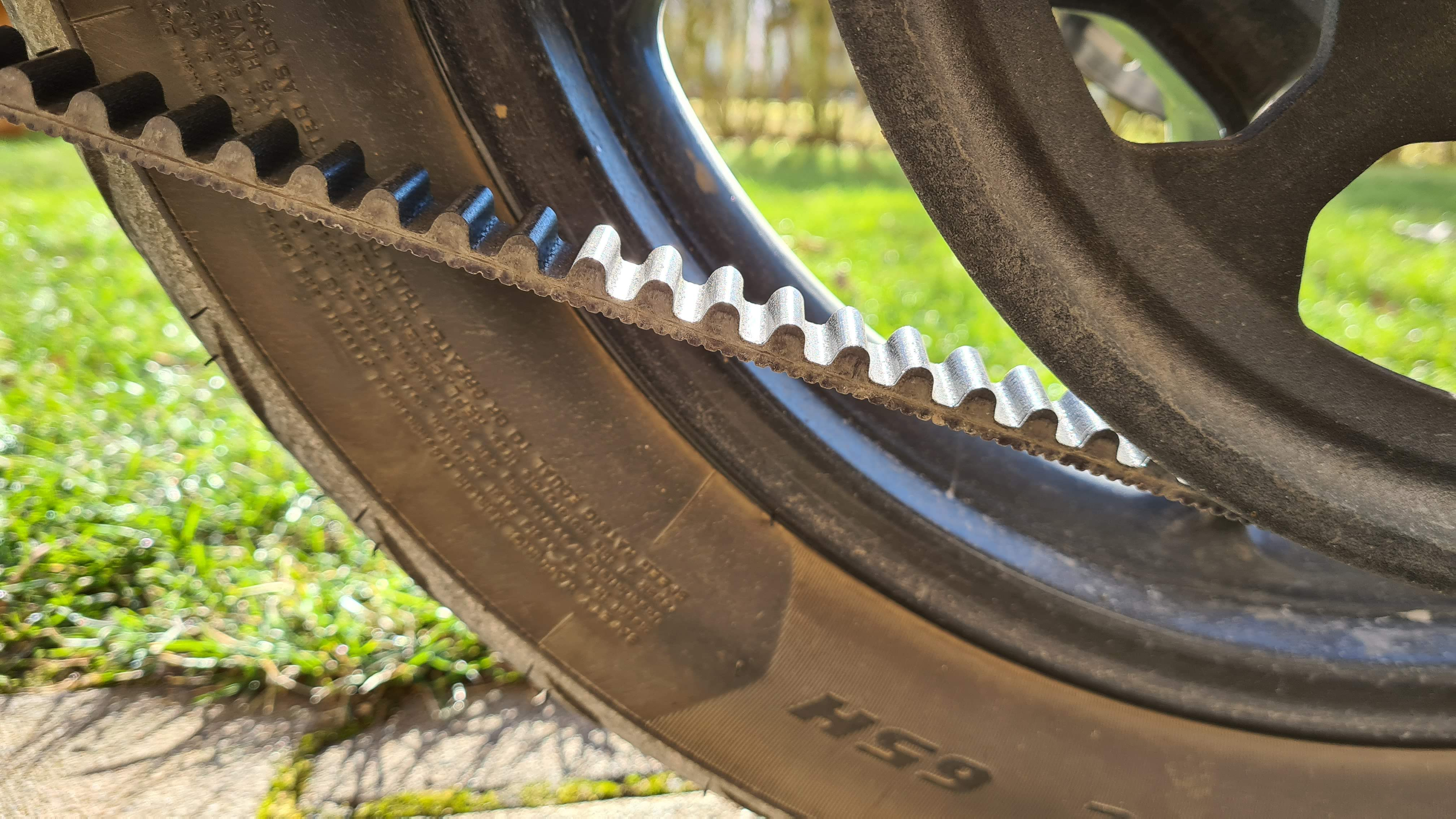 Daher auch die Anzeichen bei meiner Zero, dass sich der Riemen überhaupt nicht mehr dauerhaft spannen lies, weil im Nu wieder etwas vom Riemenrücken abgerubelt wurde. Und jegliche Fahrpräzision Fahrgriff-Straße war abhanden gekommen, wegen den sehr dünnen Restzähnen, welche ein intrinsisches Riemenspiel zu Ritzel und Abtriebsrad erlaubten, selbst bei frisch gespanntem Riemen.