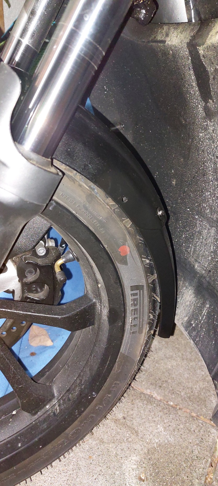 ebenso vielen Dank fürs Teilen der Datei! Ein Freund hats mir gedruckt und ich habs dann mit 3 St. 4x20mm Nieten und je 2 Beilagen angenietet. Das Loch an der Seite ist das Überbleibsel des vorher montierten 17" Fenders, der aber beim Bremsen/Einfedern am Reifen lautstark geschliffen hat.