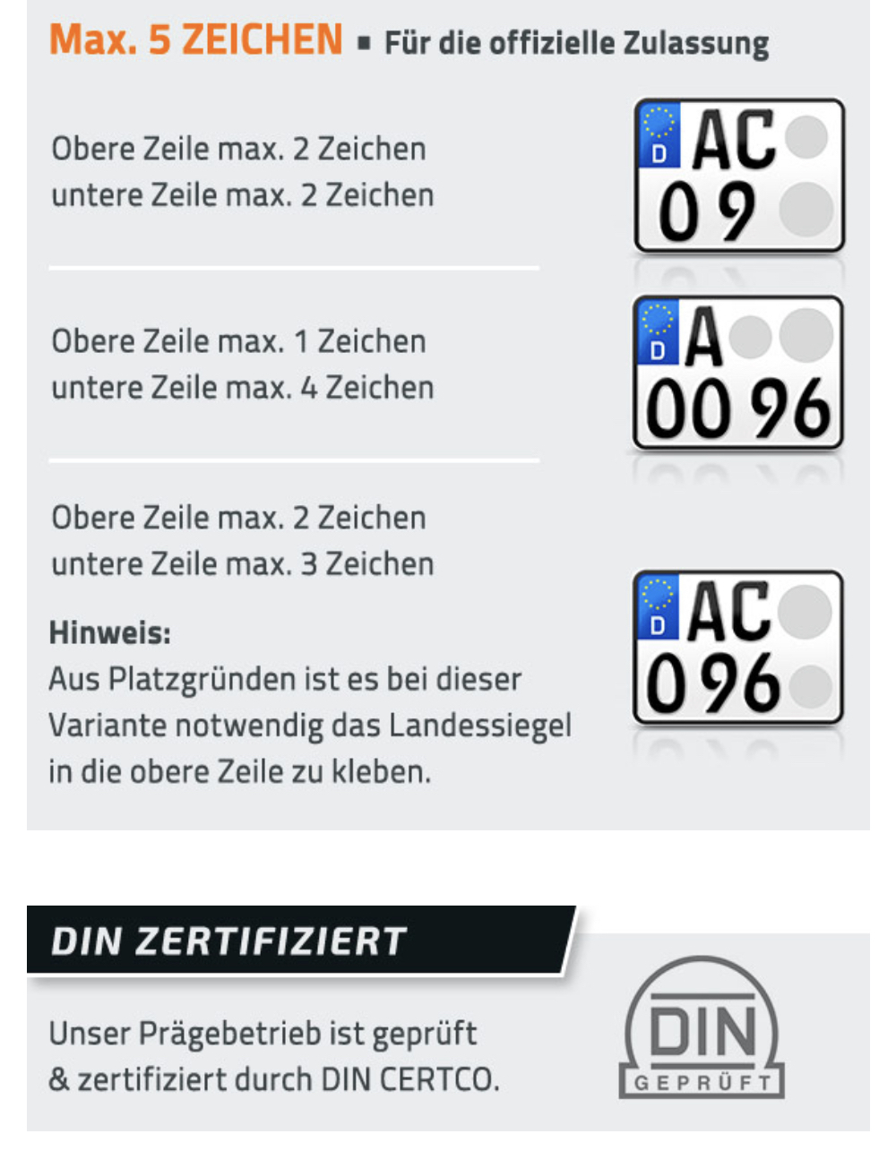 Es gibt aber auch 180x130. Passt auch noch mehr als genug raufrainer* hat geschrieben: Mo 28. Feb 2022, 13:35 Das kleinste, was normalerweise verkauft wird ist 240mm breit und 130mm hoch. Standart ist 255mm/130mm bei verkleinertem Kennzeichen für ein Leichtkraftrad. Muss ja auch noch Text drauf....