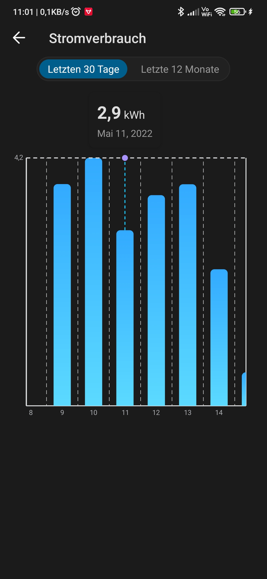 Ich komme in diesem Fall mit 42% Restkapazität Zuhause an. Bin mit 100% gestartet. Was vllt für den ein oder anderen noch nett zu wissen ist. Um wieder auf 100% auf zu laden habe ich für diese Fahrten 2,9kWh benötigt.