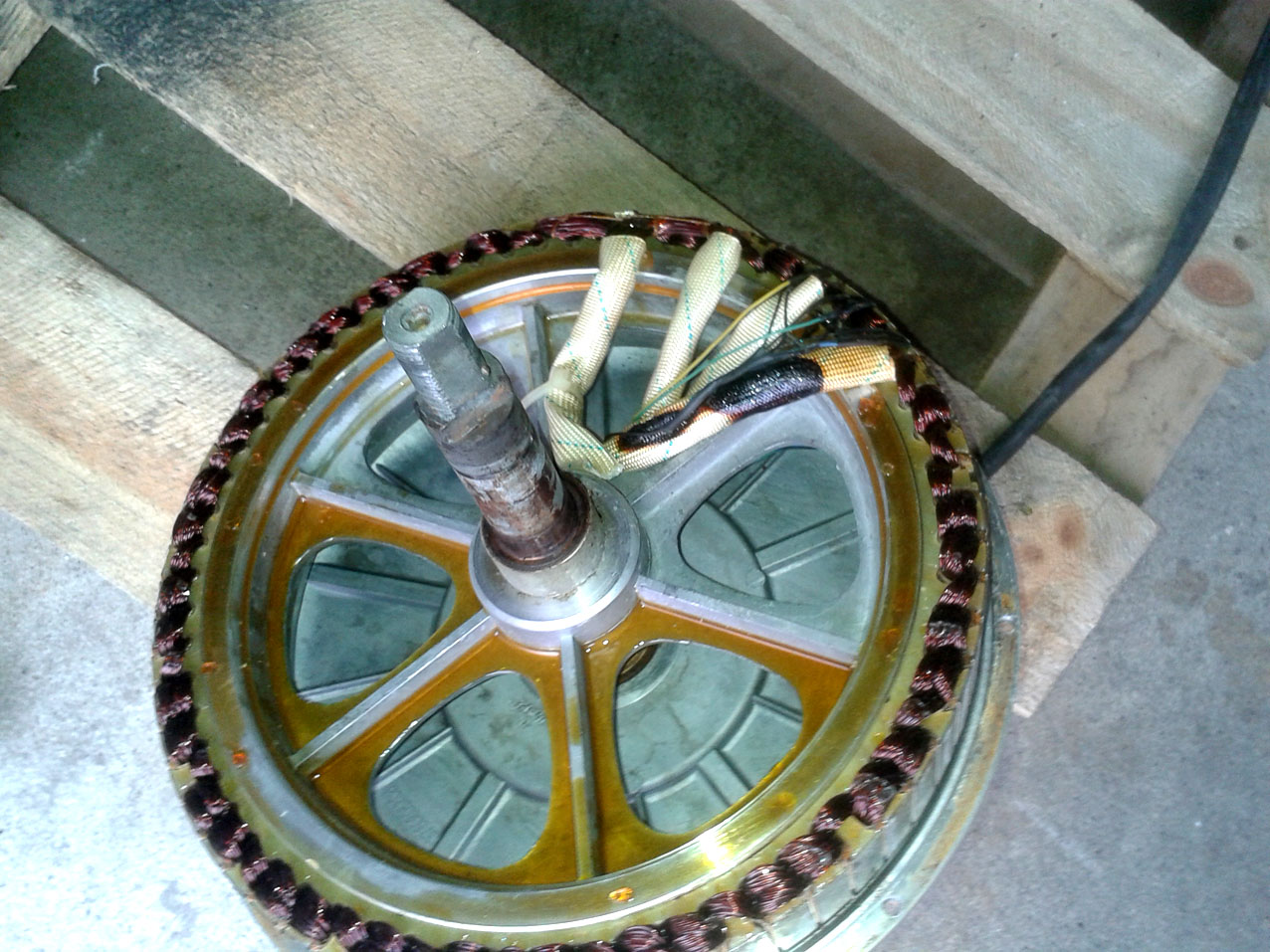 Dannach wird das lose Lagerschild vorgewärmt und über das zweite Lager mit leichten Hammerschlägen in Position gebracht und mit dem Rotorgehäuse (Glocke) verschraubt. In China wird es entsprechende Zentriervorrichtungen geben oder auch nicht, weil die Gummihammermethode die schnellste ist.