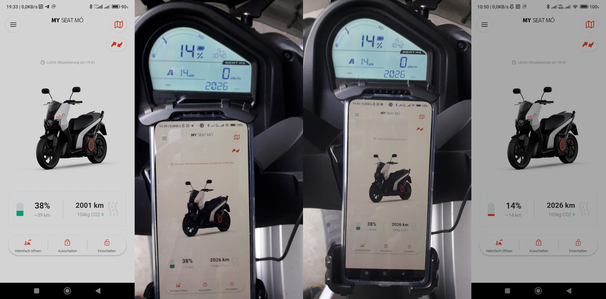 2. Bild: am nächsten Morgen meckert der Roller über fehlenden Kontakt: km stimmt, SoC ist auf dem Stand vor der Heimfahrt, aber die Restkilometeranzeige zeigt (offenbar) den Vorabendwert!