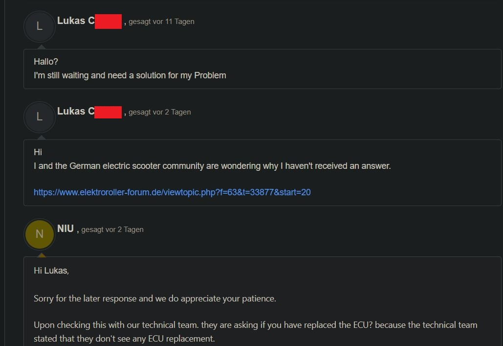 Laut deren Aussage soll ´´ECU is not responsive, and the ECU might be faulty. Please visit your nearest NIU to replace the ECU´´