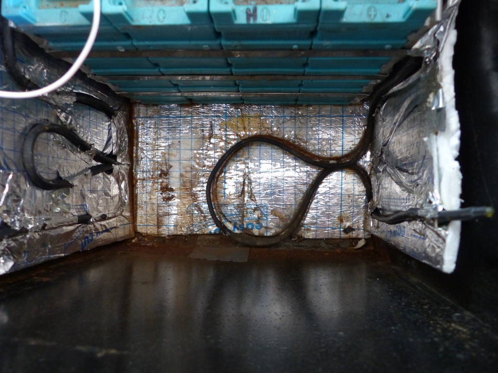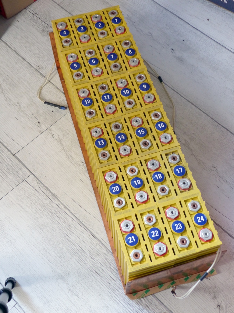Heute war der erste Großkampftag - Zellspannungen messen und Innenwiderstand ermitteln. Zuerst mal ein Bild, wie die Zellen dann mal im Batteriekasten gruppiert sein werden, auf dem Kupferblech mit Heizmatte drunter und schön deutlich numeriert: