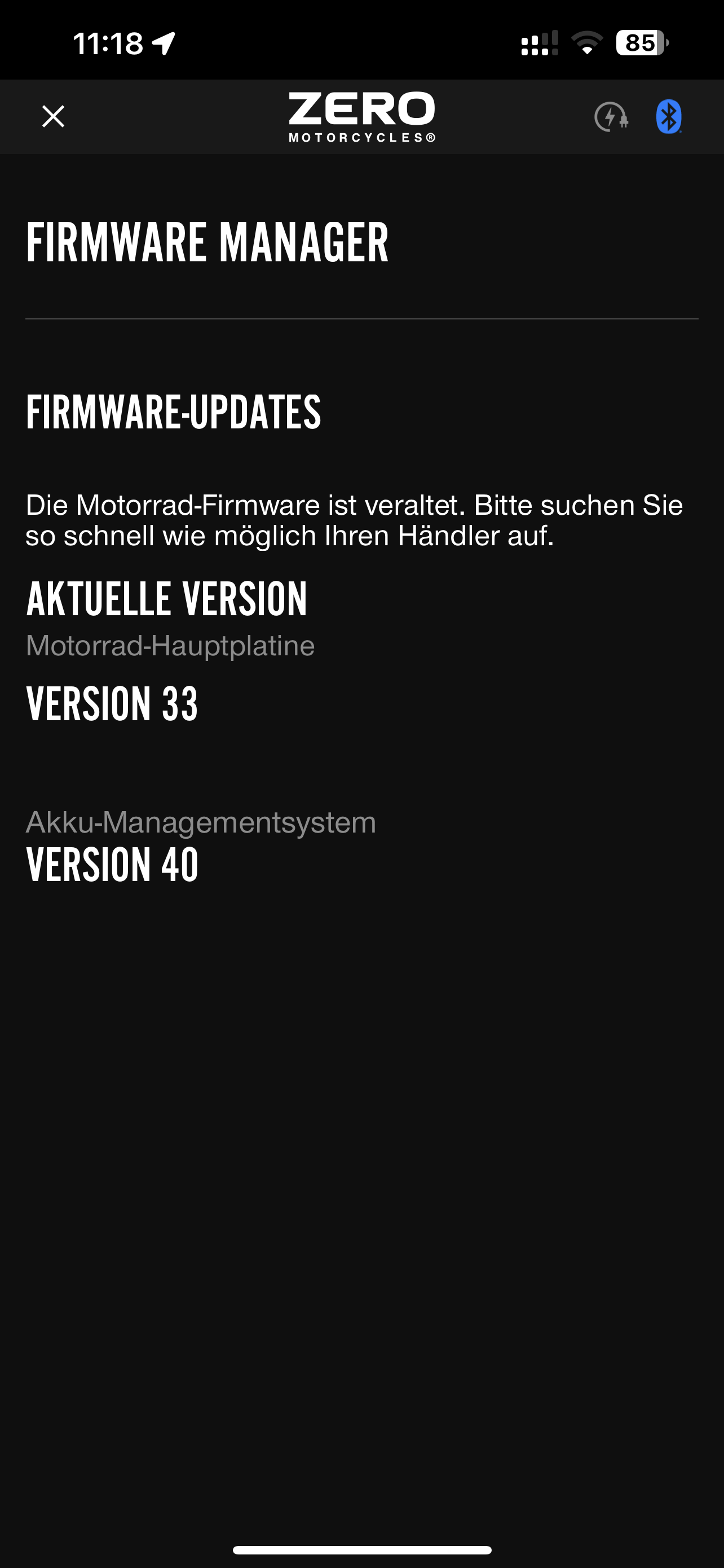 Heute Morgen hat sich die ZERO Motorcycle App verabschiedet. Der Bildschirm blieb nach dem Aufrufen schwarz. Noch nicht mal eine Fehlermeldubg kam hoch.