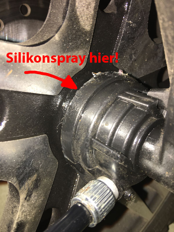 Zweite Maßnahme: In den schmalen Spalt der Plastikabdeckung (siehe Foto) reichlich Silikonspray gesprüht => Sofortige Stille!