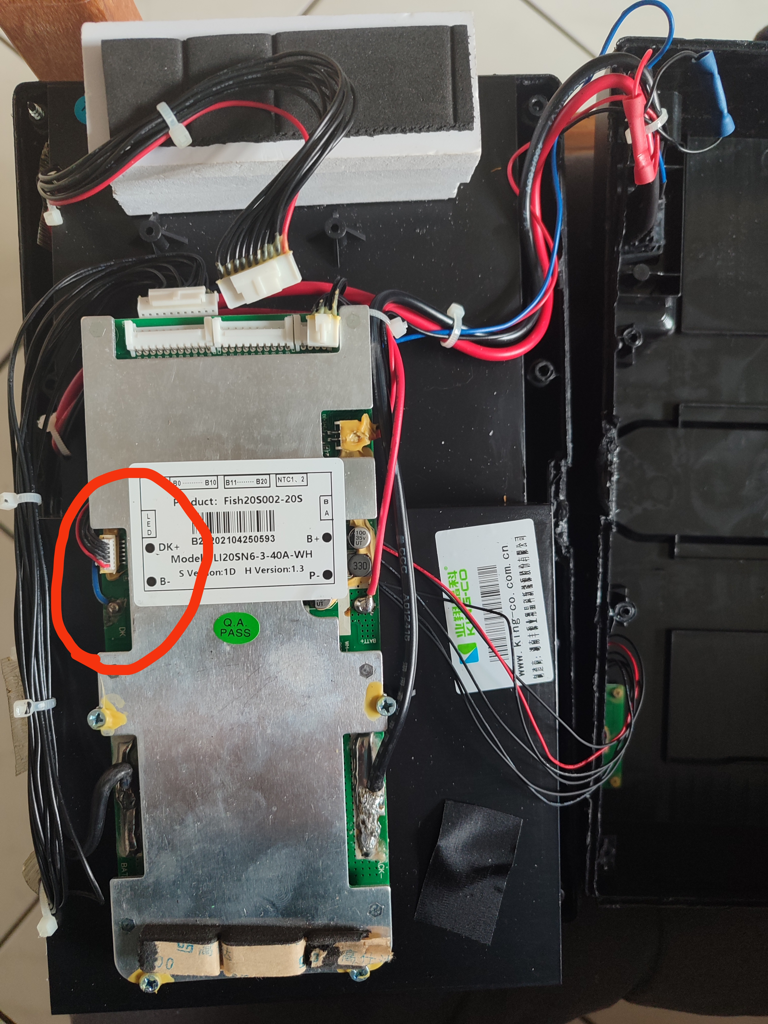 Es ist am BMS angelötet unter der Bezeichnung DK+ und führt zur Lade-/Entladebuchse.