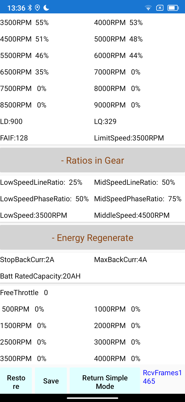 Der Fardriver zwingt hier bei Einstellung 0 dem Motor sonst den unter ratios in speed eingestellten Strom auf , nur der maximale Batteriestrom begrenzt hier das muntere treiben. Wenn da dann noch 200A drin stehen, würde der Controller bis zu 14kw aus dem Akku ziehen und im Motor in Wärme und Vortrieb umsetzen. Das könnte den Motor recht zügig grillen.
