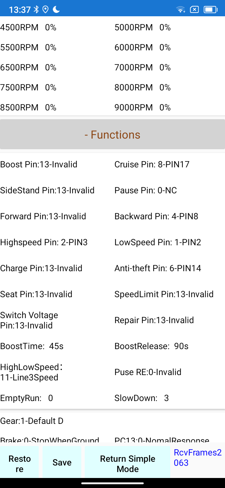 Die ganzen Funktionen bewiesen seat , sidestand, asist roll etc würde ich mal deaktivieren, da du die Pins am Controller nicht belegt hast könnte das im schlechtesten Fall auch Probleme bereiten.