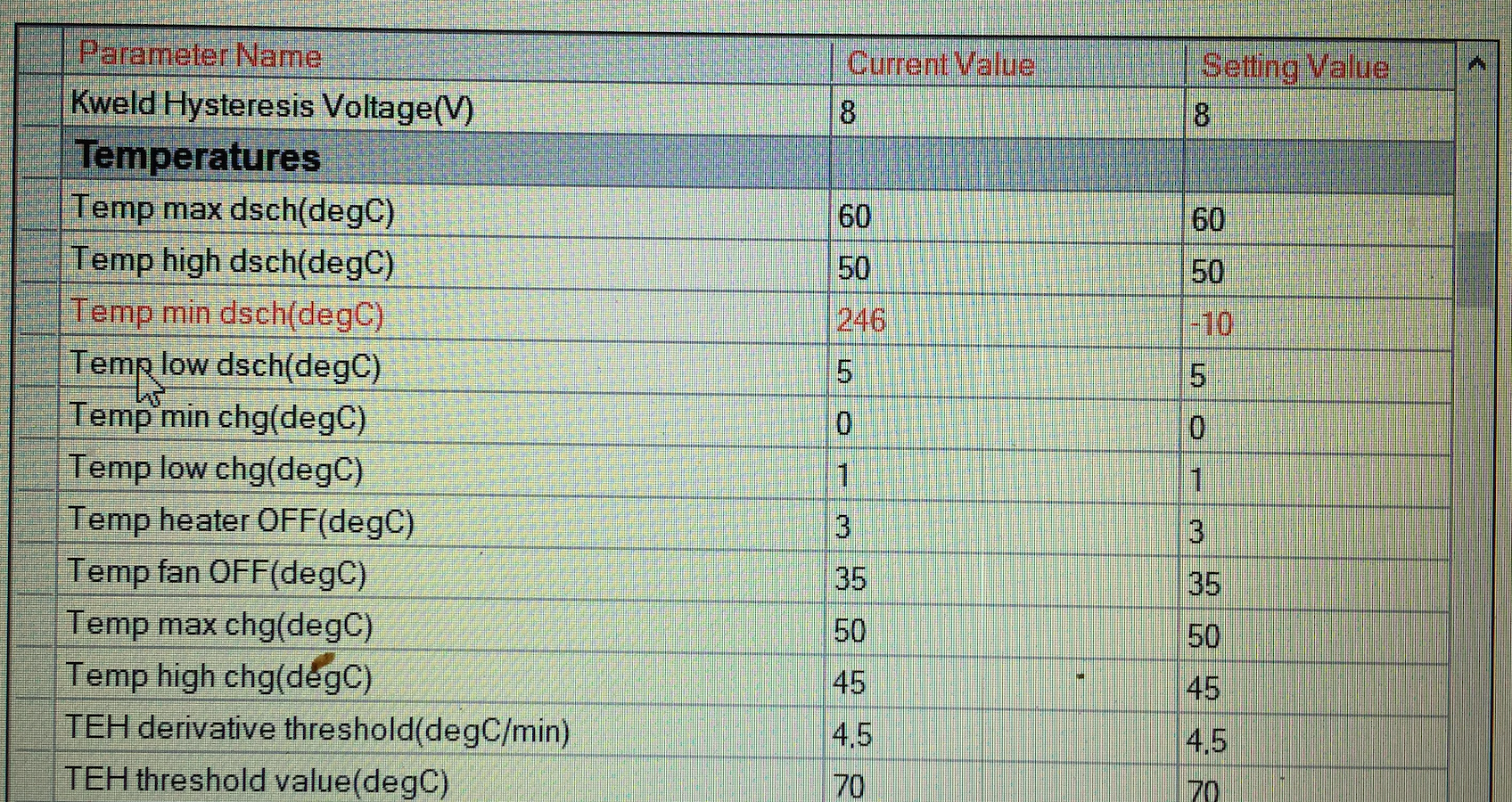 Das unterste dürften (u.a.) die Schwellen für Entladen (dsch) und Laden (chg) sein, ab denen gesperrt wird (min/max) oder z.B. Leistung reduziert/gewarnt wird (low/high). Dass der Wert bei "min dsch" so hoch ist, ist natürlich auffällig. Aber evtl. ist das nur eine Folge des INH- bzw. Thermal flags, und nicht die Ursache dafür. Und deshalb kann der Wert auch nicht verändert werden.