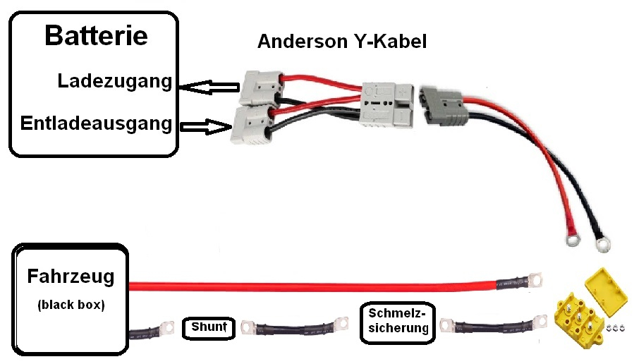 Uff. Ja hinten am Fahrzeug ist eine IEC-Steckdose, wo das Ladegerät angeschlossen wird. Aber wo "die alten Ladekabel" sind, weiß ich nicht, die Blei-Gel-Batterien werden über die gleichen Polanschlüsse auf- und entladen (s.u.). Den Kabelsalat im Inneren des Fahrzeugs blicke ich ehrlich gesagt nicht durch, man kommt schlecht ran, und ich möchte an der vorhandenen Verkabelung um Gottes Willen nichts verändern. Welche einfache Lösung gibt es dann? Evtl. ein Y-Kabel (Anderson?), dann bestelle ich die Batterie mit 2 Anderson-Steckern und schließe ein solches Kabel an den Ladezugang und den Entladeausgang und das andere Ende an ein Anderson-zu-Kabelschuhen-Adapterkabel? Siehe Skizze unten. Würde sowas funktionieren?didithekid hat geschrieben: Di 17. Jun 2025, 23:45 Hallo AndyAndy,