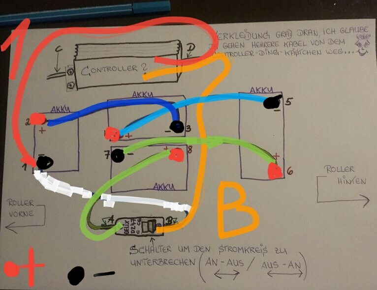 Inder Nähe des Akkus mit den Anschlossen 1 und 2 werden dann die Kabel 1 6nd B zusammengenommen ubd sind umwickelt, so dass es auf den ersten Blick wie ein Kabel aussieht .....