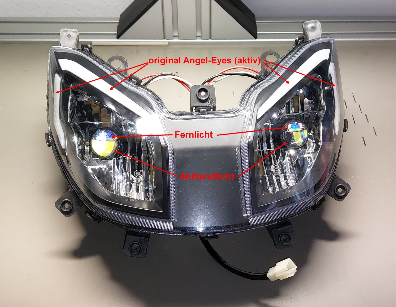 Beachte, daß das Abblendlicht 30W je Lampe hat und das Fernlicht 60W (weil in diesem Modus beide LED-Chips in der Lampe an sind) Bei 2 Lampen sind das 60W bzw 120W. Das muss der Roller liefern können! Denke auch an Leiterquerschnitte und Steckverbinder-Kontaktbelastbarkeit