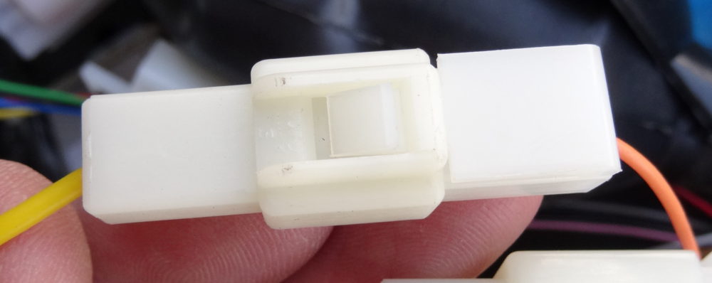 Schwarzer Flachstecker, war bei mir auf Höhe der rechten Blinkers von unten/aussen aus der Radmulde zugreifbar (damit man nicht immer den Sitz abbauen muss.