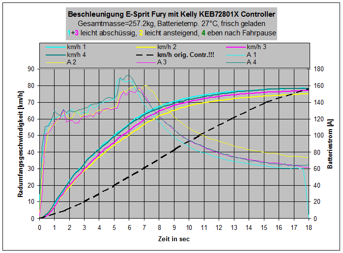E-Sprit Fury ist jetzt auch vertreten in der Tabelle, sowohl in der Serienversion Modelljahr 2010 als auch in meiner Kelly KEB72801X gepimpten Variante. Letztere wurde bei 27°C Batterietemp. gemessen, nicht Umgebungstemp. Und es sind zum ersten Mal ALLE Messwerte vorhanden außer die nicht möglichen 0-100km/h. Der Unterschied zwischen KBL72201 und KEB72801X ist allerdings recht gravierend, zumindest bis 30km/h, darüber geht es fast parallel voran.