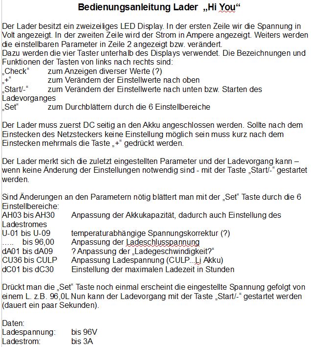 Der Lader ist recht einfach aufgebaut und nach anfänglichen Schwierigkeiten mit der Parametrierung hat das Laden geklappt. Da es keine Anleitung dazu gab habe ich eine Kurzversion erstellt.
