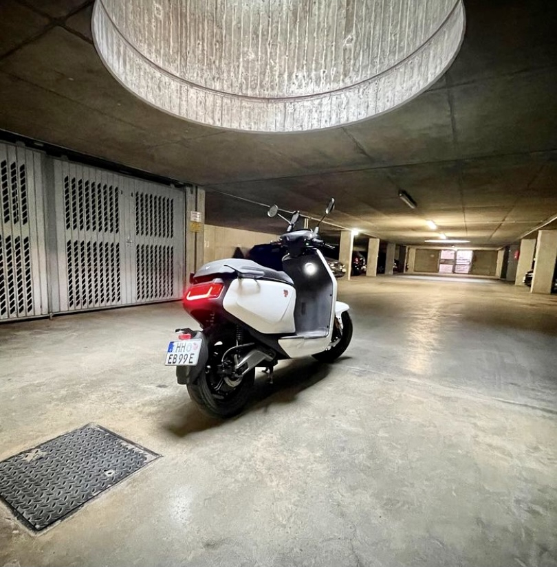 Mein Roller ist hinten zwischen Motorrad und dem NIU mit dem Beinkleid.