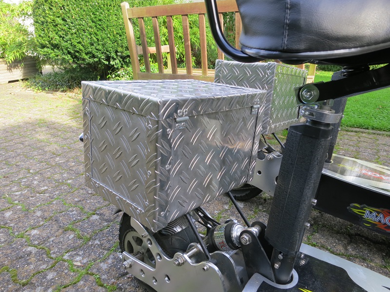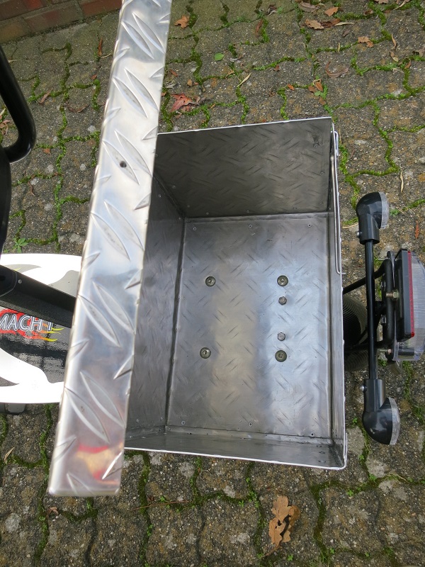unserer 2. Streetfighter hat auch eine Alu-Box bekommen. Die Abmessung (B: 32, T: 22, H: 22) habe ich wieder so gewählt, dass im Bedarfsfall 2 Akkusätze Platz haben. Meine gewonnen Erfahrungen aus der 1. Box habe ich beim Bau mit einfließen lassen.