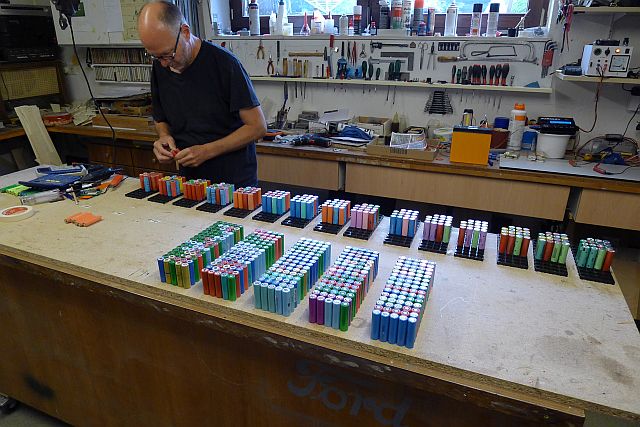Die Plastikgehäuse der alten Laptopakkus habe ich kaputtgehauen um an die Akkus heranzukommen. Manche sind aber auch nur zugeschnappt und man kriegt sie auf. Erst trennt man die Zellen voneinander, lässt aber die Lötfahnen dran. Dann misst man die Spannung jeder einzelnen Zelle. Meistens ist in einem Akkupack nur eine Zelle Defekt. Wenn eine Zelle weniger als 2,3Volt hat ist sie defekt und kommt weg. Die Zellen mit höherer Spannung Lade ich einzeln auf und lege sie dann für mindestens eine Woche zur Seite. Wenn sie danach immer noch mindestens 3,6 Volt hat ist die Zelle noch in Ordnung. Als nächstes stellt man fest wie gut die Zellen noch sind. Dazu misst man mit einem speziellen Messgerät den Innenwiederstand der Zellen. Nun werden die Zellen nach Güte sortiert. Ich habe 8 verschiedene Stapel gemacht. In jedem neu zusammengestellten Akkupack soll die gleiche Menge an verschieden guten Zellen sein. So habe die Akkupacks in etwa alle gleich. Beim Laden werden die Zellen ballanciert und alle Packs sind dann auf gleichem Niveau. Hört sich alles nach viel Arbeit an und das ist es auch. Aber es hat sich gelohnt. Bisher habe ich für einen defekten Laptopakku noch nicht über 1,80€ pro Stück bezahlt. Im Schnitt hat man dann 6 intakte Zellen.