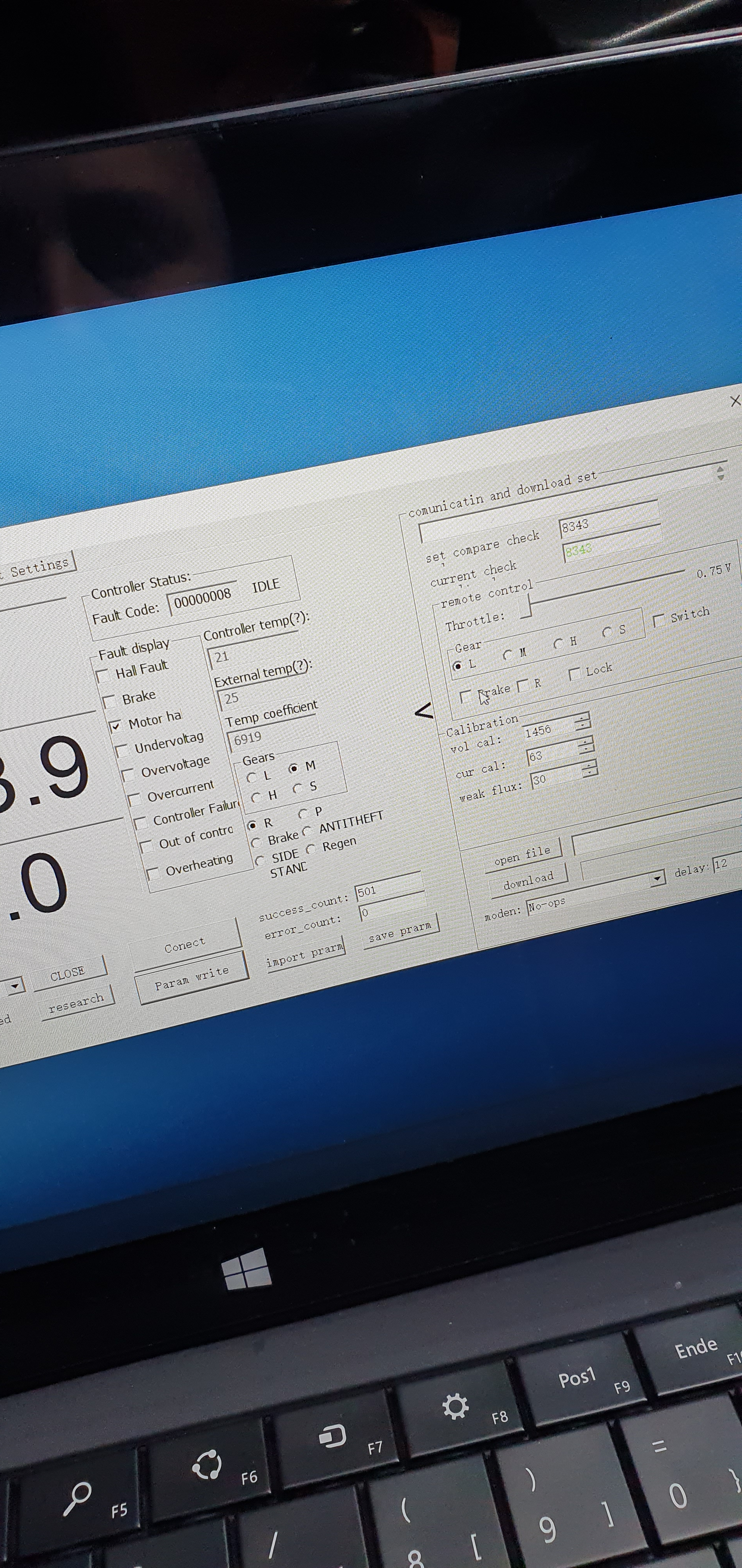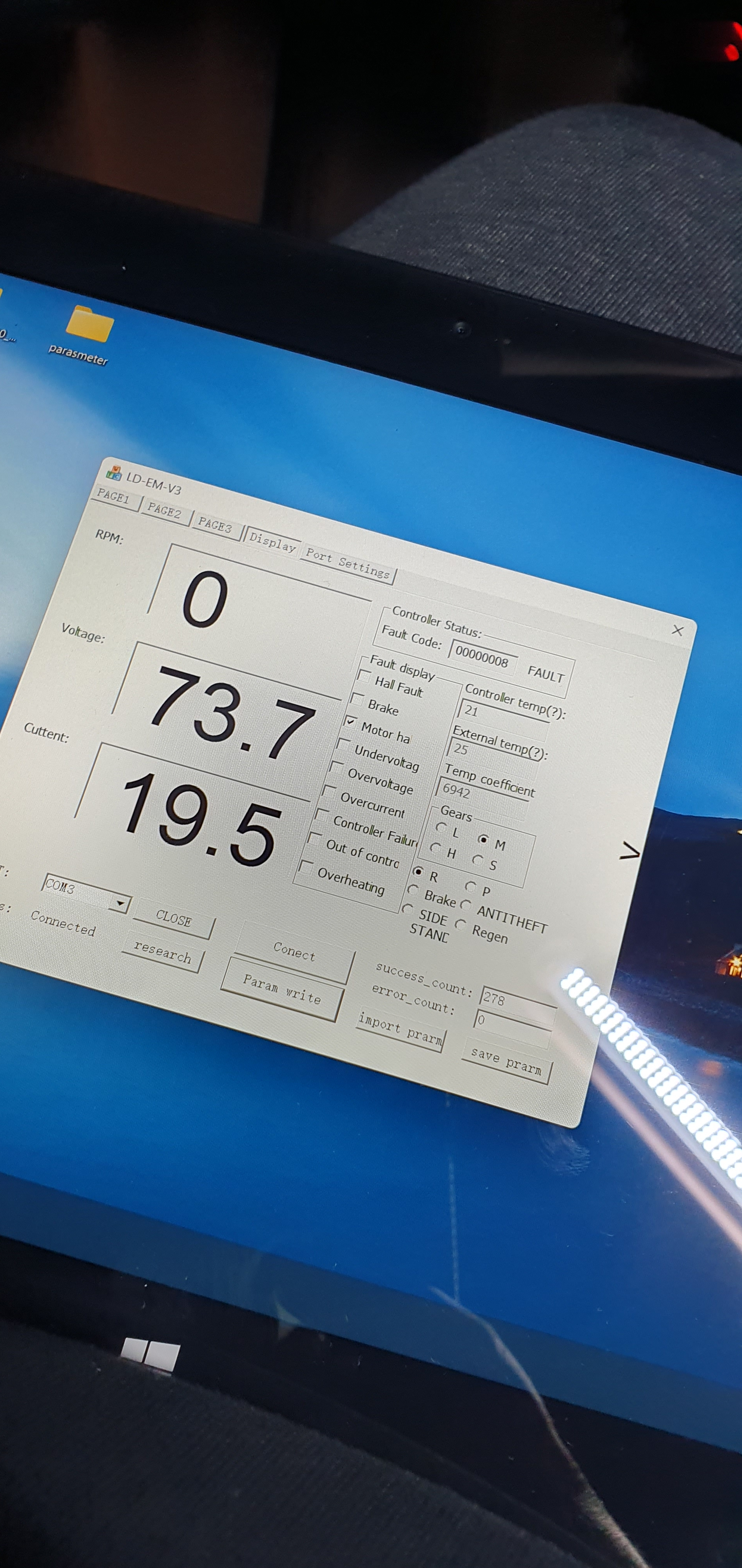 Hey Leute, ich habe ja mein kabinenroller umgebaut mit dem votol em100. Es es lief auch alles ganz gut die letzten 3-4 Monate. Heute bin ich den nennlängeres Stück gefahren, als ich ein leichtes Gefälle runter bin mit Vollgas, hat der Controller abgeschaltet. Bis ich zum stillstand gekommen bin daraufhin konte ich wieder gas geben aber nur 1-2meter den ging er wieder in den fehler Modus. Also habe ich ihn erstmal eine halbe stunde abkühlen lassen ( dachte das würde was bringen ) aber nein genau so wie vorher. Den habe ich mal ganz vorsichtig ( bis virtelgas ) gedreht und es ging. Also bin ich so die 20 km wieder zurück nachhause gefahren ( mit max virtelgas ) das ging auch aber sobald ich etwas mehr gas gebe geht er wieder in den Fehler Modus. Zuhause habe ich mal den Laptop an den Controller angeschlossen um den Fehler auszulesen ( steht im bild ) was kann das sein und was kann ich dagegen machen ? LG Maurice
