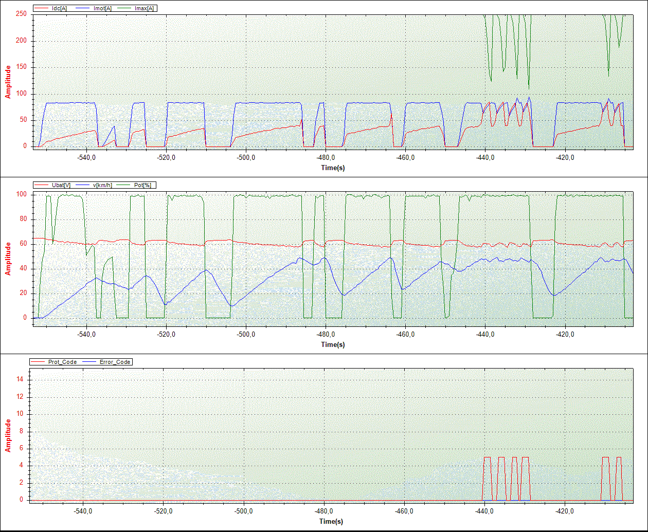 2. Den Parameter 3 - wie von Euch empfohlen - auf 2 gesetzt. Ich bin dann nur noch mal kurz die Straße hoch und runter. Der Roller kam mir noch leiser vor, kann aber auch daran liegen, daß ich keinen Helm aufhatte :o . Nicht daß der Roller jetzt etwas schneller fahren würde, oder der Controller am Ende nicht doch noch mal kurz abgeschaltet hätte, aber Ihr seid trotzdem meine Helden, denn die Imax Kurve (oberer Graph, grüne Linie) hat nun keine Einbrüche mehr und es hat keine Protection Errors (unterer Graph, rote Linie) mehr, siehe Bild: