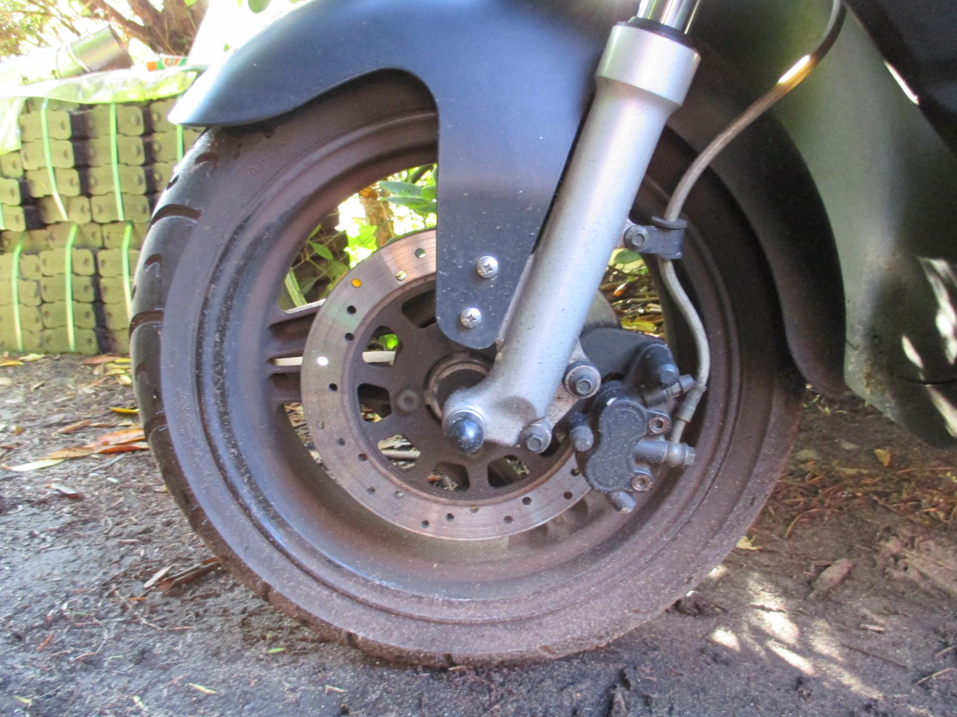 Ein Simmering an der Gabel ist defekt, weil der Holm verrostet ist. Die Verkleidung aus ABS(?) -Kunststoff ist auch nicht mehr ganz in Takt. Insofern geht es auch um eine Güterabwägung, ob es sich um einen wirtschaftlichen Totalschaden handelt.
