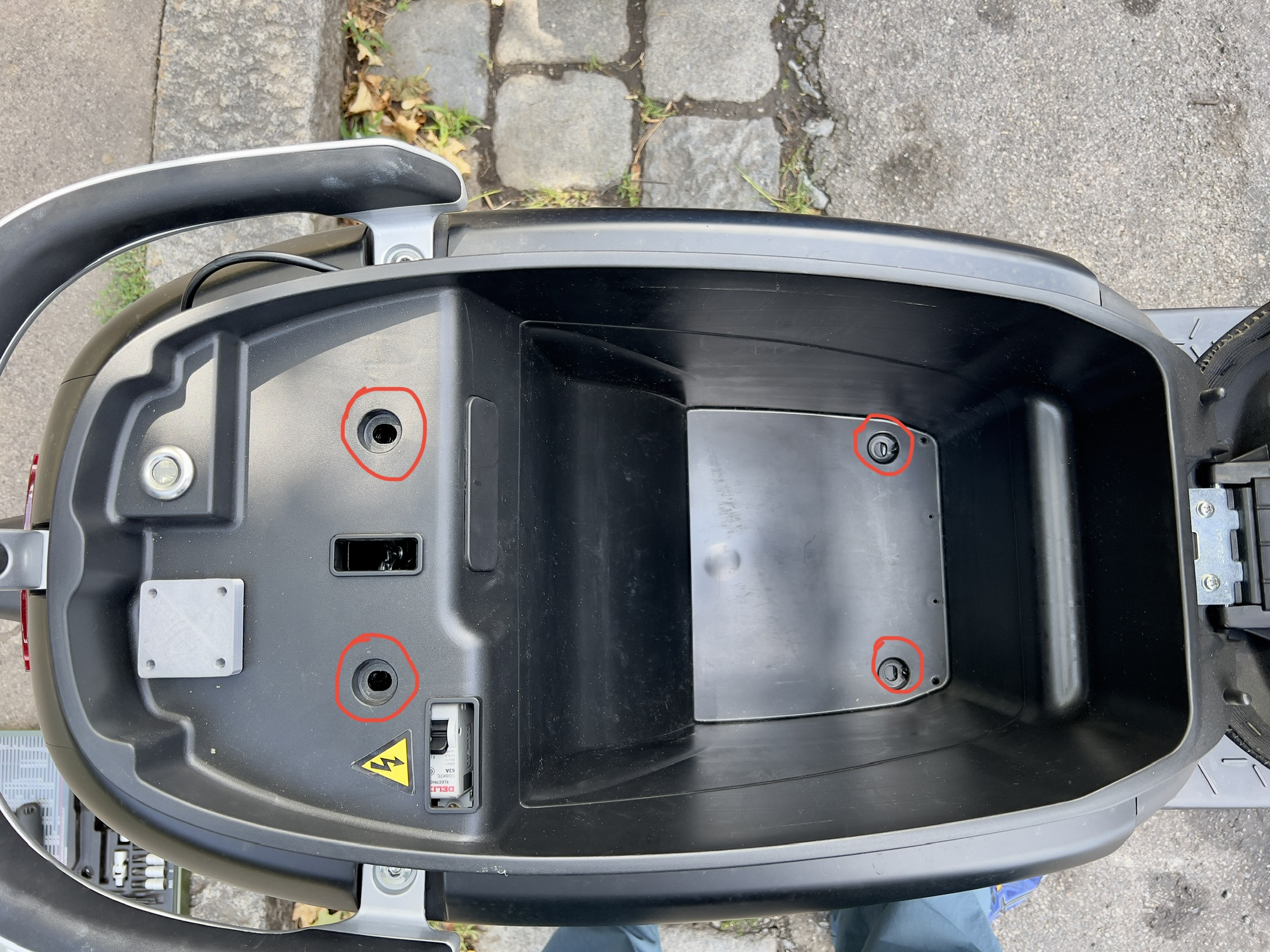 Dann die 4 Schrauben lösen, die das Helmfach halten: Anschließend die beiden Schrauben lösen, die das Motorsteuergerät halten: Das Steuergerät vorsichtig herausziehen, dabei auf die Kabel achten, die teilweise recht kurz sind.